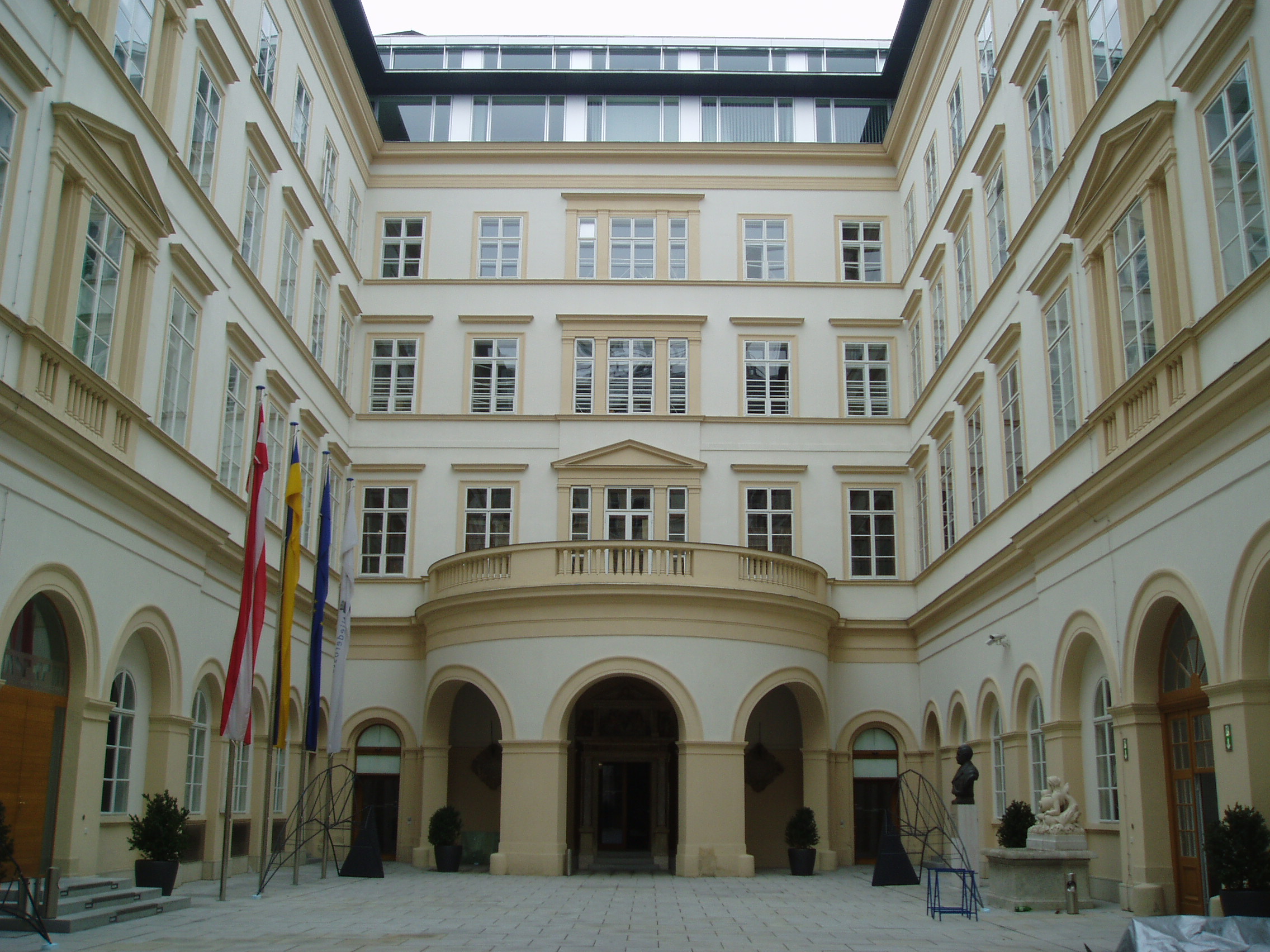 Nyilvános 1916 | 3787 | Herrengasse 13. Landhaus (a régi országház) belső udvara | A hatalmas palota építési ideje nem ismert, de az 1500-as években már állt. Azóta többször átépítették, jelenlegi klasszicista köntösét 1832-48 között kapta. Ebben a palotában ült össze évszázadokon keresztül, I. Miksa uralkodása óta az alsó-ausztriai rendi gyűlés. Ma az alsó-ausztriai kormány hivatala. Klasszicista Festsaal-ja (ünnepi terem) nevezetes hangversenyek színhelye volt. Falai között megfordult Schubert, Beethoven, s itt adta első bécsi koncertjét egy 12 éves magyar csodagyermek, Liszt Ferenc. |