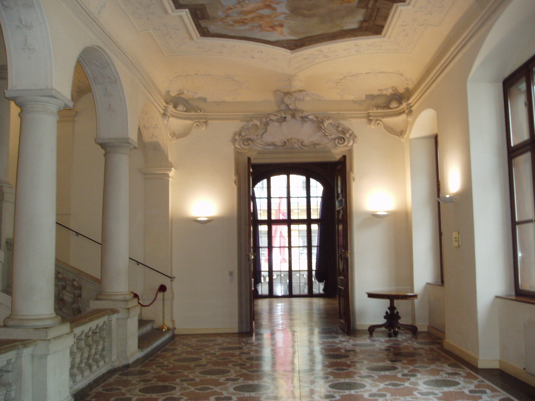 Nyilvános 2045 | 4249 | Augustinerstrasse 2. Lobkowicz-palota | Eredetileg a Dietrichstein grófok számára épült 1685-87 között barokk stílusban, az olasz Giovanni Pietro Tencala építőmester tervei szerint. A Lobkowitz hercegek kívánságára a főhomlokzatot Johann Bernard Fischer von Erlach alakította át 1709-11 között. A palota dísztermét Eroica-teremnek is nevezik, mert 1805. január 3-án Beethoven itt mutatta be III. (Eroica) szimfóniáját. E palotához fűződik az az anekdota, hogy – ugyancsak 1805-ben – Fidelio című operája első változata körüli vitában Beethoven feldühödve hagyta ott a tiszteletére összegyűlt főúri társaságot, s még visszakiabált az utcáról: „Lobkowitz szamár!” Ám a kapcsolatnak ez a dühkitörés nem vetett véget, a zenekedvelő, saját szimfonikus zenekarral rendelkező herceg továbbra is Beethoven mecénása maradt. 1807-ben ugyanitt rendezték meg Beethoven IV. szimfóniájának az ősbemutatóját is. A képen az Eroica-terem bejárata előtti előcsarnok látható, a szemben levő ajtó vezet a terembe (a freskókkal ékesített zeneteremben nem lehet fényképezni). Ebben a palotában tekinthető meg az Osztrák Színháztörténeti Múzeum gyűjteménye is. |