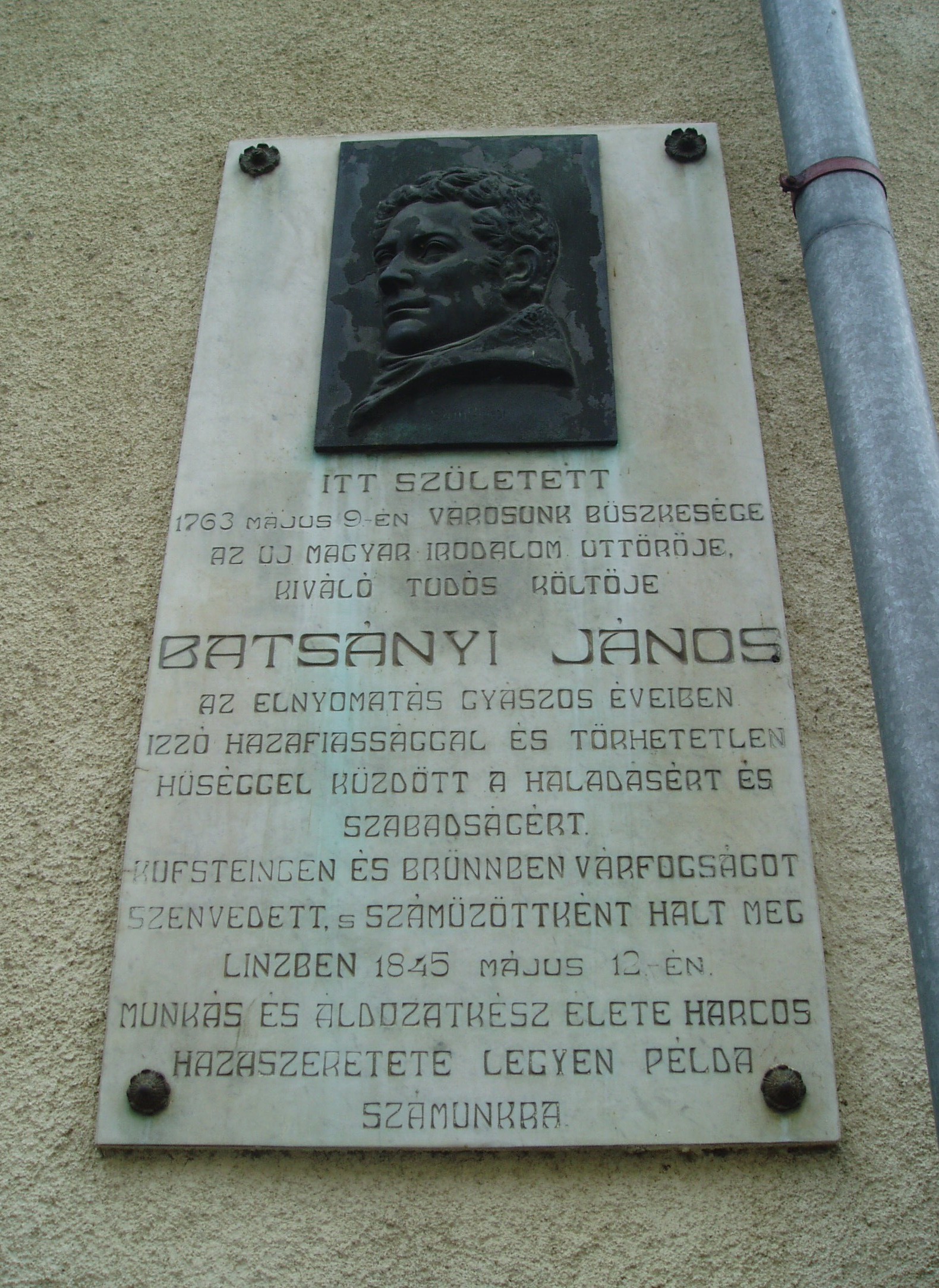 Nyilvános 1417 | 2126 | Tapolca, Batsányi János utca 12. | A mostani ház helyén állt Batsányi János költő szülőháza. Az emléktáblát 1931-ben állították. Itt született a felvilágosodás neves költője 1763. május 9-én. Iskolai tanulmányit Tapolcán kezdte (lásd: Tapolca, Templom domb 8.), majd Keszthelyen, Veszprémben (lásd: Veszprém, Vár utca 8.) és Pesten folytatta. Kassán Kazinczy Ferenccel és Baróti Szabó Dáviddal kezdte szerkeszteni a Magyar Museum című folyóiratot. Ebben jelent meg 1789-ben híres verse, "A franciaországi változásokra", amelyben arra szólít fel, hogy "vigyázó szemetek Párizsra vessétek". Batsányi részt vett a Martinovics-féle összeesküvésében (vádiratát lásd: Tapolca, Templom domb 8.). Egy éves kufsteini várfogság után Bécsben hivatalnokként kereste kenyerét. 1805-ben vette feleségül az osztrák költőnőt, Baumberg Gabriellát. 1809-ben lefordította és kiegészítette Napóleon magyarokhoz intézett proklamációját. A Bécsből kivonuló francia csapatokkal Párizsba ment, ahol 1815-ben a Párizst megszálló osztrák katonaság elfogta. Spielberg várbörtönéből felesége közbenjárására kiszabadult, de Linzbe száműzték, ahova felesége is követte. Ott hunyt el 1845-ben. Hamvait - felesége hamvaival együtt - 1934-ben hazaszállították Tapolcára. Sírjuk az ún. Régi köztemetőben található, eredeti síremléküket a múzeumban (Templom domb 8.) helyezték el. A felvétel 2007 februárjában készült. Felh. irod.: Látnivalók Veszprém megyében. Miskolc, Well-PRess, 2000 Hangodi László: Múltbanéző - kiállításvezető a Tapolcai Városi Múzeum tárlataihoz. Tapolca, 2006 |