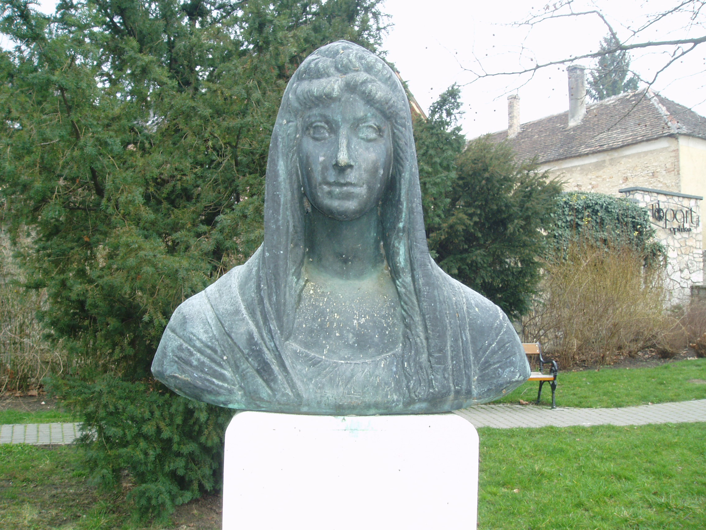 Nyilvános 1009 | 1955 | Tapolca, Batsányi tér: Baumberg Gabriella szobra | A Malom-tó melletti ún. Kis-tó nyugati partján helyezték el Batsányi Jánosné Baumberg Gabriella mellszobrát. Kocsis András szobrászművész alkotását 1964-ben avatták fel. A fénykép 2007 februárjában készült. Felh. irod.: Látnivalók Veszprém megyében. Miskolc, Well-PRess, 2000 |