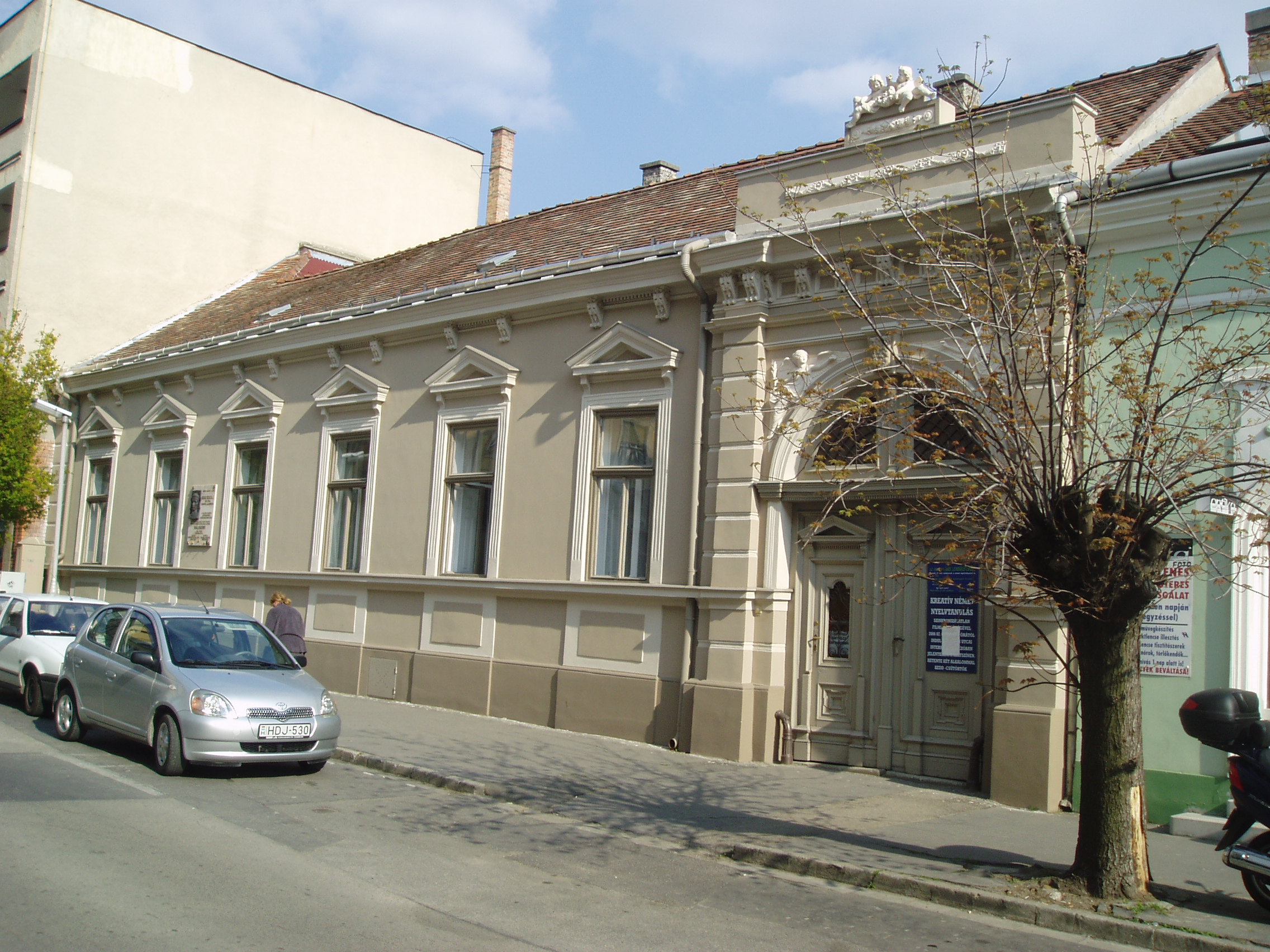 Nyilvános 1454 | 2120 | Pápa, Deák Ferenc utca 2. | Ebben a házban lakott Kiss Zoltán (Fadd, 1914. jan. 18. – Bp., 1952. ápr. 11.), a magyar katonai ejtőernyőzés egyik megteremtője. 1938-ban fiatal hadnagyként került a Bertalan Árpád által szervezett ejtőernyős kísérleti keretbe és azzal együtt Pápára. 1941-ben, Bertalan halála után az egység parancsnokává nevezték ki. 1944-ben ezredesként vett részt a második világháborúban. 1945 után a repülőakadémia ejtőernyős kiképzője volt, de 1951-ben letartóztatták, 1952-ben koholt vádak alapján halálra ítélték és kivégezték. A fénykép 2007 áprilisában készült. Felh. irod.: Veszprém megyei életrajzi lexikon. Veszprém, Veszprém Megyei Önkormányzat Közgyűlése, 1998 Veszprém megyei életrajzi lexikon. Veszprém, Veszprém Megyei Önkormányzat Közgyűlése, 1998 |