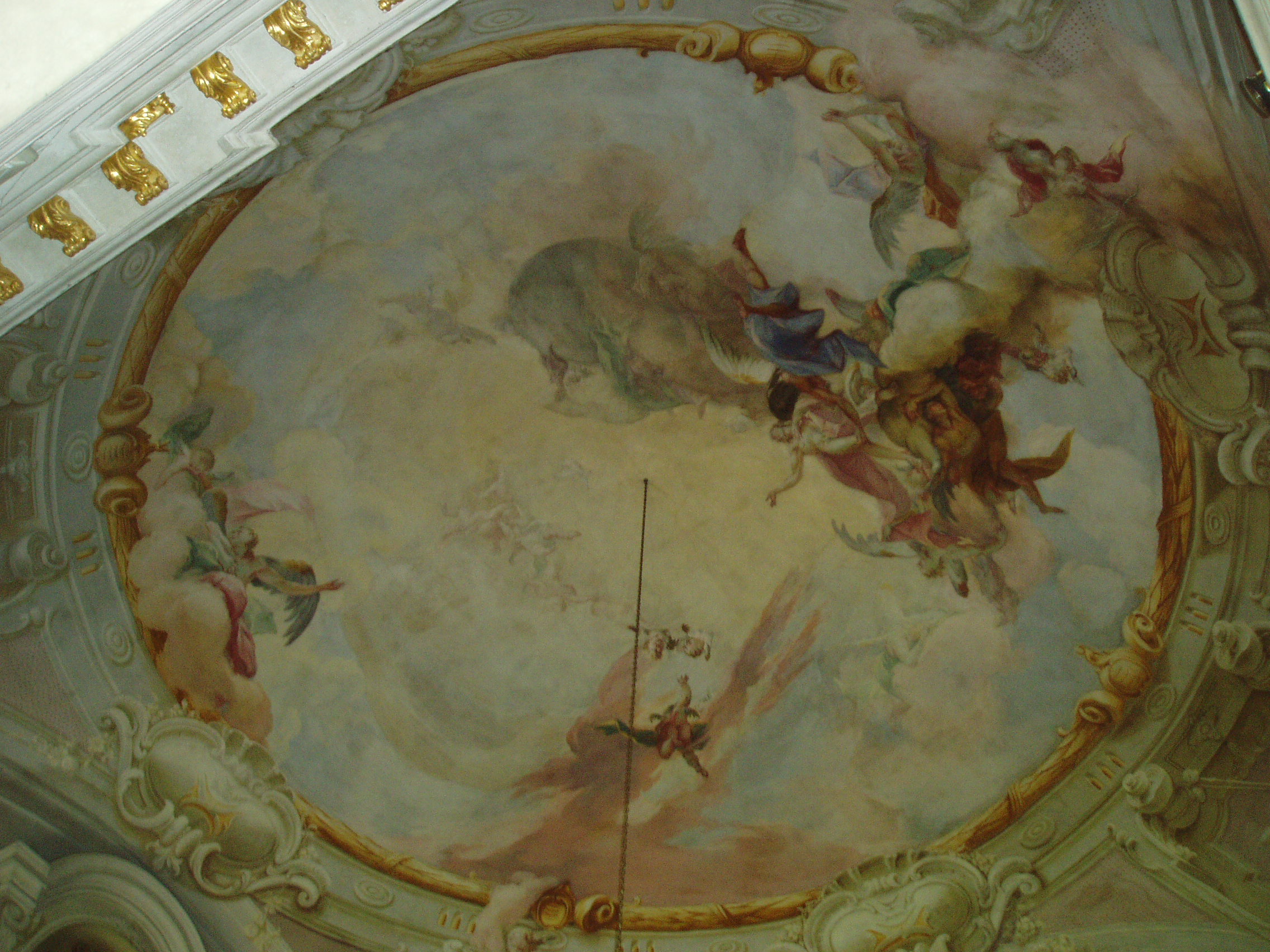 Nyilvános 1417 | 2073 | Pápa, Fő tér 1-3. Esterházy-kastély | A barokk kastély a korábban itt állott végvár helyére épült, részben annak alapfalai, kövei felhasználásával. A régi várat az 1740-es évektől Esterházy Ferenc (1683–1754) tárnokmester kezdte átalakítani Franz Anton Pilgram tervei alapján. A barokk várkastély kialakítása 1784-re fejeződött be Esterházy Ferenc fia, Eszterházy Károly egri püspök idejében Fellner Jakab, majd Grossmann József vezetésével. Az U alakú, egyemeletes épület a versailles-i palota nyomán elterjedt francia kastélytípus képviselője. Az épület keleti szárnyának emeletén volt a kastély kápolnája. Az 1988/89-ben végzett restaurálás eredményeképpen ma újra megcsodálható a helyiség eredeti architektúrája és Joseph Ignaz Mildorfer 1750 körül festett mennyezetképe, amely Krisztus mennybemenetelét ábrázolja. A kápolnában, amelynek példaszerű felújításáért a város 1990-ben Europa Nostra díjat kapott, ma a Jókai Mór Városi Könyvtár olvasóterme működik. A fénykép 2007 áprilisában készült. Felh. irod.: Németh Adél - Szabó Lajos: Pápa. Bp. Panoráma, 1989 Pápa. Szerk. Sz. Farkas Aranka. Bp., Magyar Képek, 2000 |