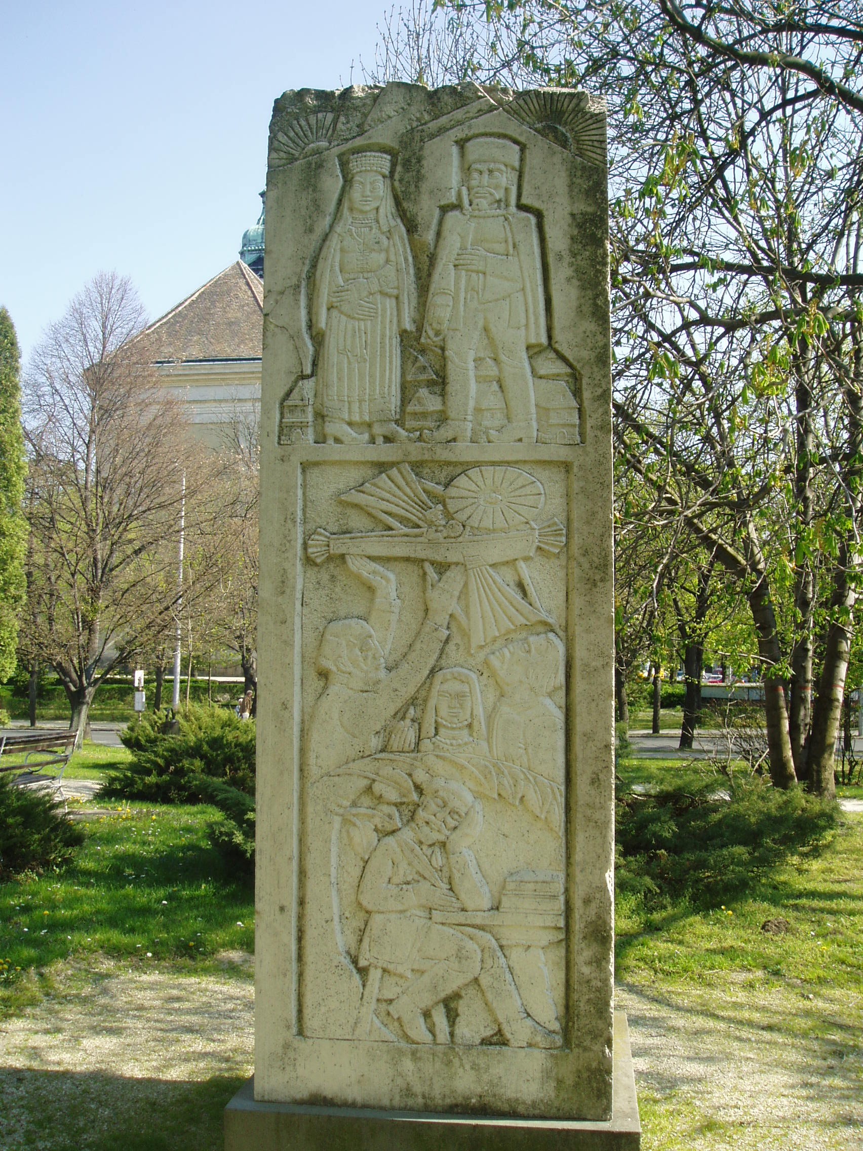 Nyilvános 1082 | 1682 | Pápa, Fő tér 1-3. Jókai-oszlop | Az Esterházy kastély előtti, a Fő tér felé néző parkban két egykori pápai diák - Jókai Mór és Petőfi Sándor - emlékére állított szoborkompozíció áll. Jókai Mór emlékoszlopa Szervátiusz Jenő és Szervátiusz Tibor alkotása. A négyzetes hasáb alakú mű felületét Jókai Mór és regényalakjainak domborműves ábrázolásai borítják. A fénykép 2007 áprilisában készült. Felh. irod.: Németh Adél - Szabó Lajos: Pápa. Bp. Panoráma, 1989 |