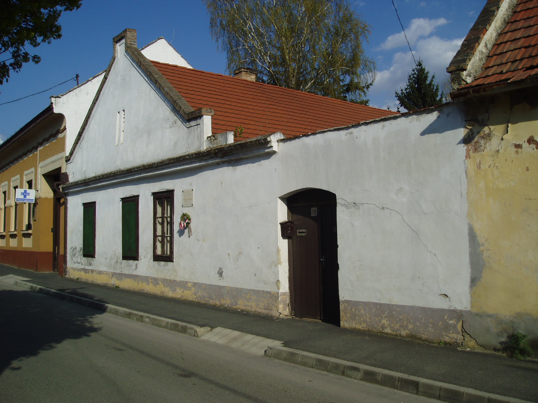 Nyilvános 1014 | 1671 | Pápa, Gyurátz Ferenc utca 18. | Mint a homlokzaton elhelyezett emléktáblán is olvasható, ebben a kis házban lelt először otthonra Pápán Petőfi Sándor 1841 márciusában. Petőfi - akkor még Petrovics - Sándor akkor szerelt le a kis híján katasztrófával végződő katonai szolgálatból, s reménytelen helyzetben volt: iskoláit félbehagyta, apja kitagadta. Ekkor ment Pápára, mert tudta, hogy unokatestvére, Orlai Petrich Soma az ottani kollégiumban tanul. Akkor ebben a kis házban egy Kis Gábor nevű diák is volt koszton-kvártélyon, s mivel Orlai Petrich még nem ért haza az iskolából, a háziasszony őt kérte meg, hogy vigye szobájába Petőfit, aki iránt külseje miatt bizalmatlan volt. Kis Gábor később így emlékezett: "Elképzelhetni, milyen lehetett a sors üldözte, ágról szakadt isten-katonája, az ő megviselt uniformisában. És ne vegye senki rossz néven, ha a rendet annyira kedvelő háziasszony ugy nyilatkozott előttem. Dehogy hitte, de ki is hitte volna, hogy az a katona egykor a Dalaim és Magyarország annyi dalainak szerzője. Bementem Petőfiért, ott ült a háziasszony szobájában egy széken, a 'sárgapitykés, zöldhajtókás közlegény': mellette a padlón ellapulva hevert az üres vászontarisznya, a bot az ágynak támaszkodott görcsös fejével ... Magam bemutatása rövid volt, mit is mondhattam volna sokat, a lábain céhláda nagyságu bakancsokban előttem álló Petőfit vendégemül meghívám, ő vette a botot és a tarisznyát s mentünk ... a mi szobánkba... Hazajött Orlay ... A legelső estét a mi szobánkban töltöttük; ... a barátság melegénél, mert borunk kevés volt, felmelegedett az elcsigázott, vézna alaku költő, csak hamar láng csapott ki homlokán, szavalt idegen költők műveiből, Horác ódáit egymásután mondta könyv nélkül..." Körülbelül három hétig tartózkodott itt Petőfi, amikor elhagyta Pápát, mert édesapjától megbocsátó levelet kapott. A fénykép 2007 áprilisában készült. Felh. irod.: Németh Adél - Szabó Lajos: Pápa. Bp. Panoráma, 1989 Petőfi emlékhelyek a Kérpát-medencében. Kiskőrös, 1996, Petőfi Sándor Társaság "A kényes úrfi s a rongyos baka". Tanulmányok két halhatatlan pápai diákról. Pápa, 2001, Pápai Református Gyűjtemények |