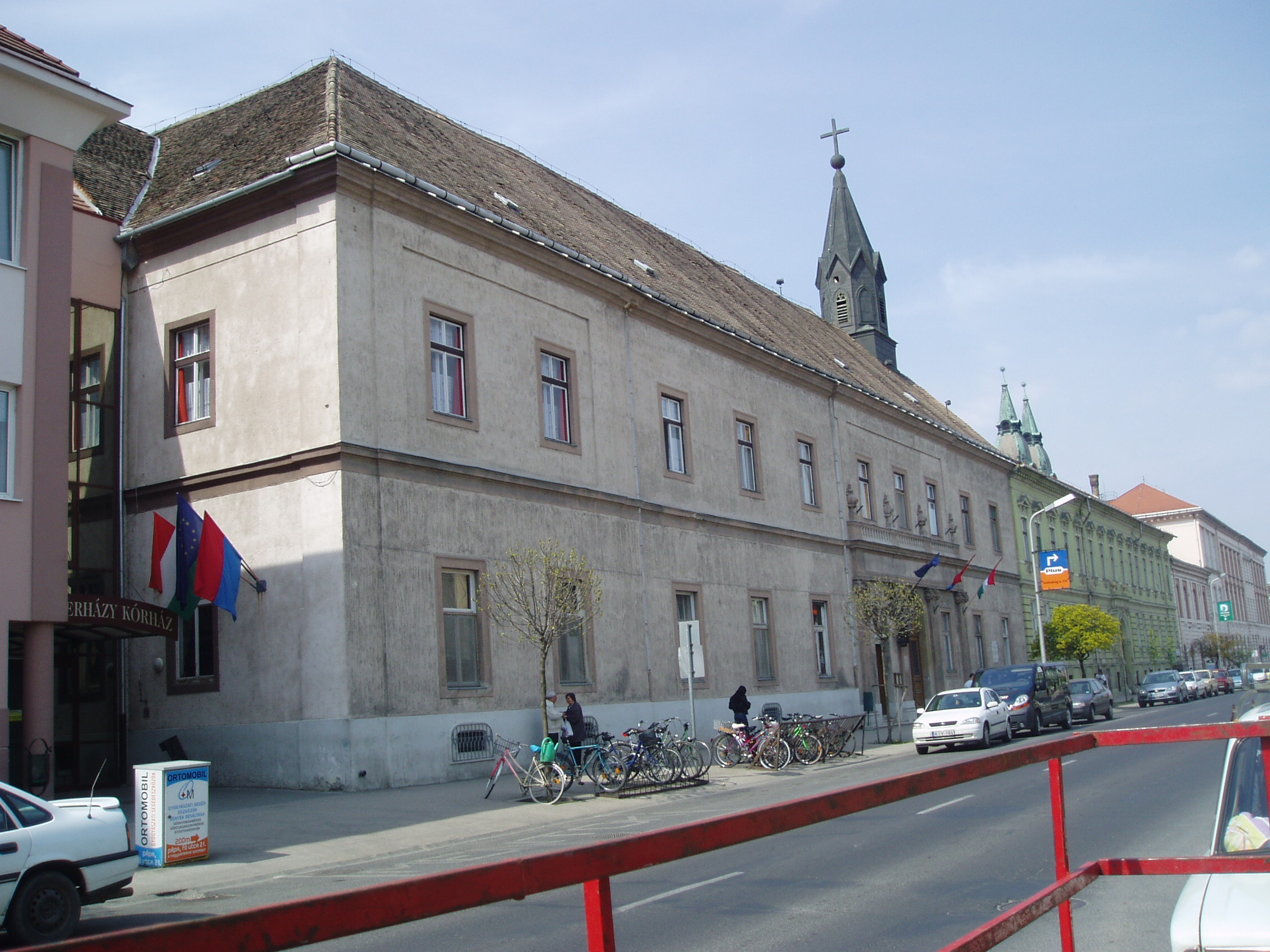 Nyilvános 1391 | 1892 | Pápa, Jókai utca 7. | A kórház régi épülete 1763-1768 között készült el Fellner Jakab tervei alapján. Az irgalmas rendet 1730 körül gróf Esterházy Ferenc telepítette le Pápán az akkor gyakori pestises betegek ápolására. Első kórházuk is ezen a helyen volt, melynek céljára a Zöldfa vendéglőt alakították át. A mai kórházat 1757-ben alapította Eszterházy Károly, Pápa ura, akkor váci, majd egri püspök (lásd még: Pápa, Jókai u. 9.). A Fellner Jakab által épített, azóta kibővített és átalakított épület egyemeletes, szárnyai négyszögű udvart vesznek körül. A ma is látható torony az egykori kórházkápolnához tartozott. A főbejárattól balra található az 1757-ben alapított patika, amely ma múzeum, illetve magángyógyszertárként ma is működik. Belső terét csehsüvegboltozat fedi. Az ajtót keretező provinciális jellegű festmények 1782-ben készültek. Védetté nyilvánított berendezése művészi értéket képvisel. A fénykép 2007 áprilisában készült. Felh. irod.: Németh Adél - Szabó Lajos: Pápa. Bp. Panoráma, 1989 |