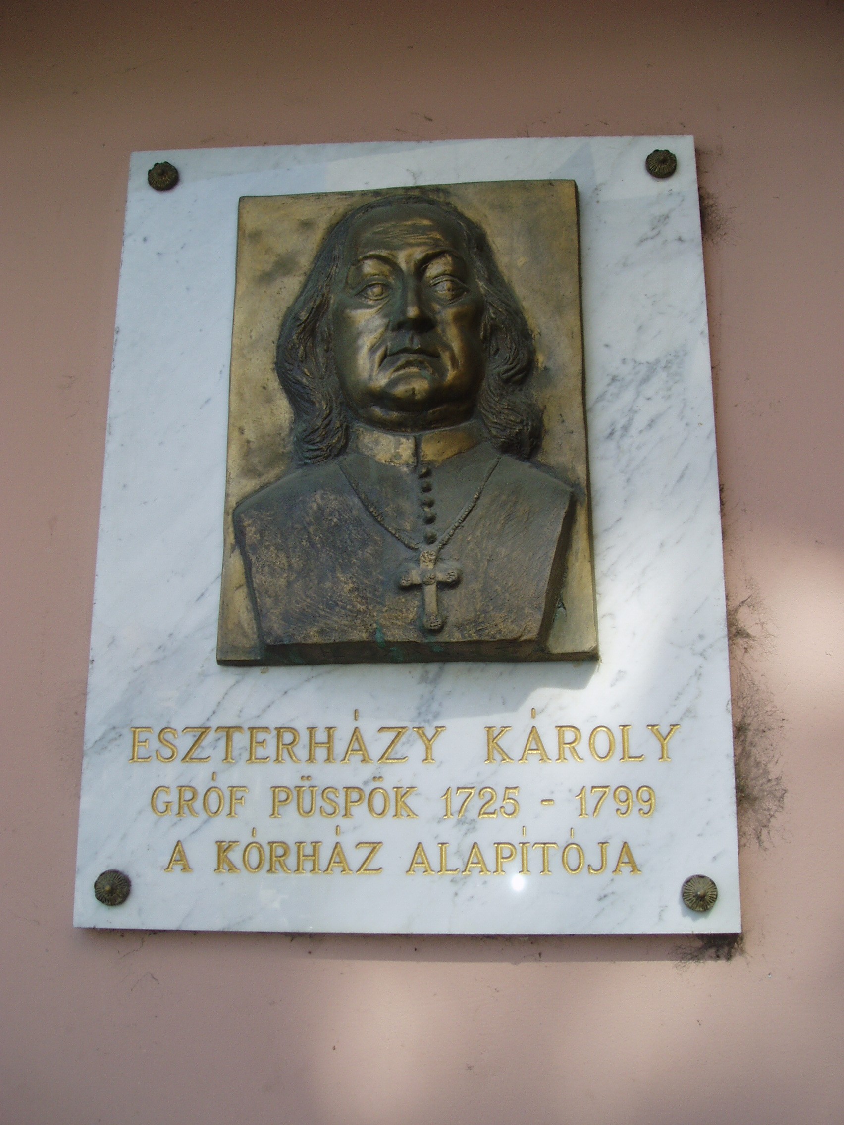 Nyilvános 1151 | 1920 | Pápa, Jókai utca 9. | A kórház közelmúltban átadott új épületén - a régi épület szomszédságában - gróf Eszterházy Károly (1725-1799) portrédomborműves emléktáblája látható. Pápán a kórházi ápolás bevezetése az Esterházy Ferenc által 1730 körül betelepített Irgalmas rend nevéhez fűződik. Pápa városi kórházát 1757-ben alapította Esterházy Károly - akkor váci, majd egri püspök -, Pápa ura. A szomszédos épület (lásd: Pápa, Jókai u. 7.) az ő adományából épült Fellner Jakab vezetésével. A fénykép 2007 áprilisában készült. Felh. irod.: Németh Adél - Szabó Lajos: Pápa. Bp. Panoráma, 1989 Veszprém megyei életrajzi lexikon. Veszprém, Veszprém Megyei Önkormányzat Közgyűlése, 1998 |