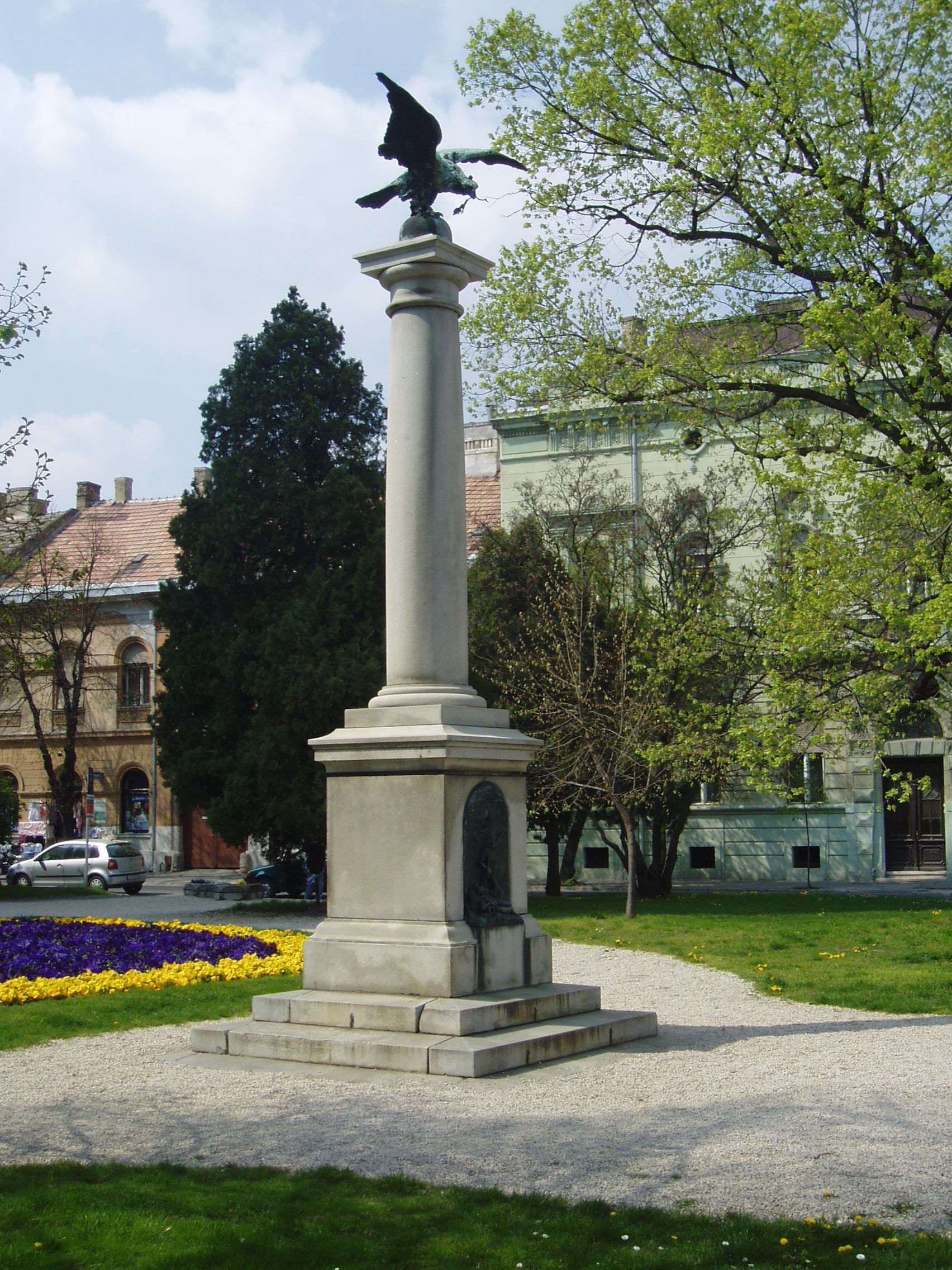 Nyilvános 1070 | 2013 | Pápa, Március 15. tér: Honvéd emlékmű | A református templom előtti kis parkban, a Jókai utca felőli oldalon álló Honvéd emlékmű ifj. Vastagh György alkotása. 1896-ban állították fel a Pápa melletti ihászi csata emlékére. A hengeres oszlopon kiterjesztett szárnyú, bronz turulmadár ül. A négyzetes talapzaton levő bronzrelief csatajelenetet ábrázol. A szabadságharc egyetlen Veszprém megyei csatája 1849. június 27-én zajlott le Ihász térségében (korábban, június 13-án Kmetty György győzelmet aratott Csornán). Június 27-én az ihászi pusztán Kmetty megtámadta a Marcaltő elfoglalására siető Schütte osztrák tábornokot. A csata nem végződött egyértelmű győzelemmel, de a magyaroknak heves ágyútűzzel sikerült hátráltatni az osztákokat. Azonban az erős osztrák lovasság Kmetty csapatait végül visszanyomta Pápa felé. A fénykép 2007 áprilisában készült. Felh. irod.: Németh Adél - Szabó Lajos: Pápa. Bp. Panoráma, 1989 |