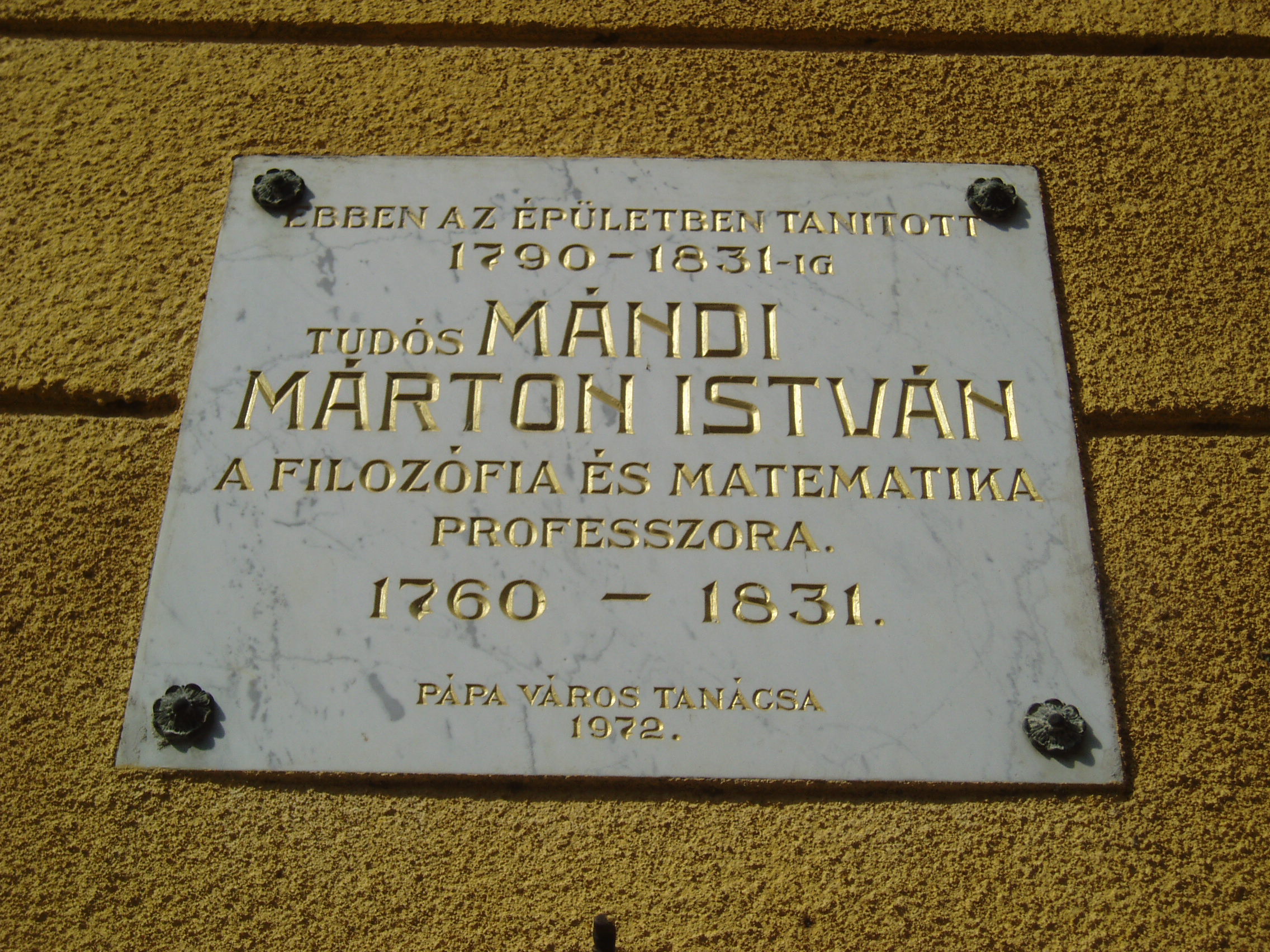 Nyilvános 1029 | 1829 | Pápa, Petőfi utca 13. Ókollégium | A híres pápai Református Kollégium első épülete 1531 és 1752 között a mai Ruszek közben, a Lábasház épületének helyén állott. 1752-ben - Mária Terézia rendeletének következtében - harminckét évig csak a közeli Adásztevelen működhetett. 1784-ben, II. József türelmi rendeletének köszönhetően térhetett vissza az iskola Pápára, s hamarosan felépült a később Petőfi Sándorról elnevezett utcában a most látható épület, amelyben 1794-ben indulhatott meg az oktatás. A jelentős tömegű, szögben megtörő késő barokk épület kimagaslik az utca XVIII-XIX. századi alacsony épületei közül. Homlokzatkiképzése egyszerű. Az épületbelsőben hangulatos, szűk folyosók és boltozatos szobák idézik a régi diákélet hangulatát. A főbejárat felett emléktábla örökíti meg egykori híres tanárainak és tanulóinak nevét. Az épületben tanított Mándi Márton István professzor. Ő volt az első Magyarországon, aki Kant filozófiáját - ebben az épületben - tanította. Az ő neéhez fűződik az adászteveli száműzetés után az iskola nagy fellendülése. A XIX. században híres tanárai voltak Tarczy Lajos és Bocsor István. Tarczy hirdette először Magyarországon katedráról a hegeli eszméket, amiért később le is kellett mondania a filozófia tanszékről. Ő volt a híres Képzőtársaság (az iskola önképzőköre) első elnöke. Egyénisége maradandó hatással volt irodalmunk számos későbbi kiválóságára, Petőfire, Jókaira, Eötvös Károlyra. (Lásd még: Pápa, Alsóvárosi temető; Pápa, Jókai u. 26.). Bocsor István 1837-től tanított itt. Magyar nyelvű történelemórái a város közönségére is nagy hatást gyakoroltak. A szabadságharc bukása után visszavonultan, tanári munkásságának élt. Alakját Kozma Andor: A karthágói harangok c. versében örökítette meg. (Lásd még: Pápa, Alsóvárosi temető; Pápa, Széchenyi u. 10.). Jeles tanár volt rajtuk kívül Váli Ferenc, Jókai Mór sógora (lásd még: Pápa, Alsóvárosi temető; Pápa, Jókai u. 20.). Ide járt iskolába az 1841/42-es tanévben Petőfi Sándor és Jókai Mór. Különösen Petőfi életében jelentett döntő momentumot az itt eltöltött időszak (lásd még: Pápa, Petőfi u. 11., Pápa, Jókai u. 13.). Az épületben tanult még Orlai Petrich Soma, Thaly Kálmán, Eötvös Károly, Kozma Sándor és mások. Az intézmény 1857-ig működött ezen a helyen, ekkor átköltözött a Március 15. tér 13-15. számú házba, az ún. Nátus-ba, majd 1895-ben utolsó végleles helyére, a Március 15. tér 9. számú monumentális épületébe. Az egykori Ókollégium ma (2007) gimnazista lányok diákotthona. Itt található a pápai születésű (lásd: Pápa, Március 15. tér 8.) Rab Zsuzsa költő és a Pápán is diákoskodott Hegyi Imre néprajztudós könyvtára. Rab Zsuzsa még életében adományozta könyvtárának jelentős részét a pápai alma maternek, míg Hegyi Imre könyvtára özvegye révén került a Református Gimnázium tulajdonába. A fénykép 2007 áprilisában készült. Felh. irod.: Németh Adél - Szabó Lajos: Pápa. Bp. Panoráma, 1989 Pápa. Szerk. Sz. Farkas Aranka. 2. kiad. Veszprém - Bp., Magyar Képek, 2000 |