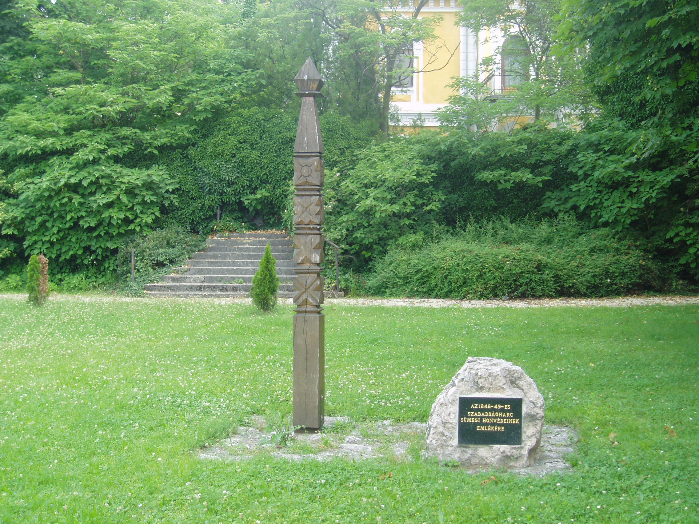 Nyilvános 966 | 1527 | Sümeg, Kossuth utca 35. után | Az Eitner-ház (lásd: Kossuth u. 35.) északra néző oldalhomlokzata egy kis parkra tekint. A két világháború között itt állt az Országzászló, később pedig a szovjet emlékmű. A képen látható kopjafát az 1848/49-es szabadásgharc sümegi honvédei emlékére állították. A fénykép 2007 júniusában készült. Felh. irod.: Koppány Tibor - Kozák Károly: Sümeg útikalauz. Veszprém, Idegenforgalmi Hivatal, 1965 Látnivalók Veszprém megyében. Miskolc, Well-PRess, 2004 Sümegi kalauz. Sümeg, Sümegi Fórum alapítvány, 1993 |