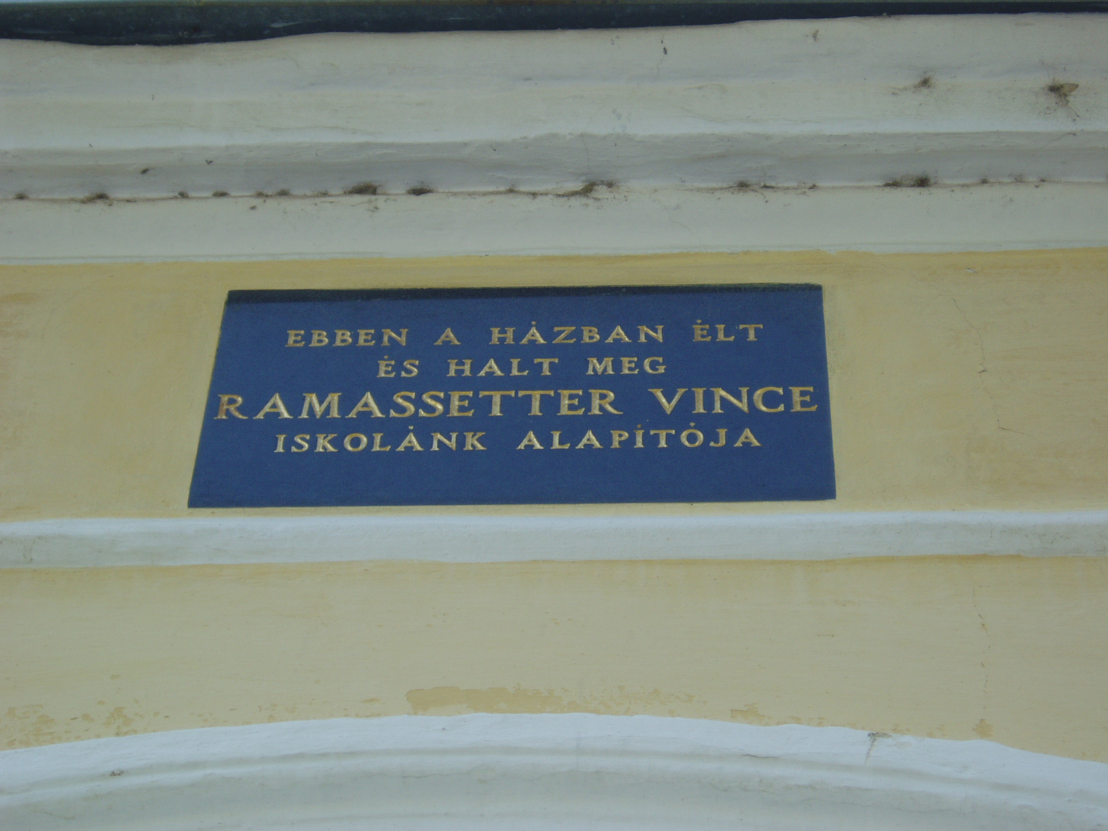 Nyilvános 1402 | 1850 | Sümeg, Ramassetter utca 10. | A Ramasetter utca házai jórészt a XVII. század második felében épültek, bár a legtöbbet később átalakították. A 10. számú épület is barokk stílusú, földszintes ház volt eredetileg, amelyre később emeletet építettek, s homlokzatát eklektikus stílusban átalakították. Az épület homlokzatán olvasható emléktábla szerint ebben a házban élt és halt meg Ramassetter Vince, "Sümeg atyja". Ramassetter Vincének a városban egészalakos szobra (lásd: Sümeg, Kossuth u. 13.) és több emléktáblája is látható, köztük a közelben álló szülőházán is (lásd: Sümeg, Deák F. u. 6.). A város jótevője a helyi köztemetőben nyugszik (lásd: Sümeg, Temető: Ramassetter Vince sírja). A fénykép 2007 júniusában készült. Felh. irod.: Koppány Tibor - Kozák Károly: Sümeg útikalauz. Veszprém, Idegenforgalmi Hivatal, 1965 Veszprém megyei életrajzi lexikon. Veszprém, Veszprém Megyei Önkormányzat Közgyűlése, 1998 www.ekmk.hu/emlekhely/Emlekhelyek.html |