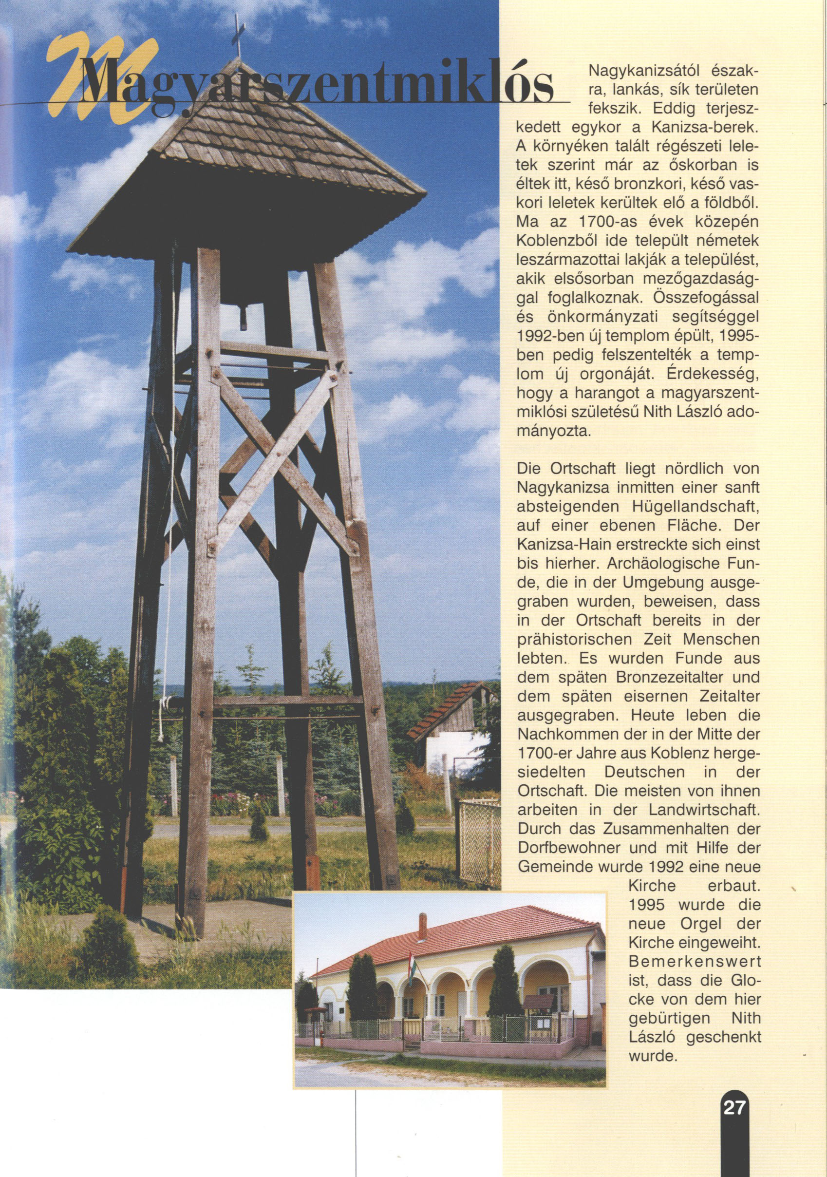 Nyilvános 2405 | 6787 | Magyarszentmiklós | Die Ortschaft liegt nördlich von Nagykanizsa inmitten einer sanft absteigenden Hügellandschaft, auf einer ebenen Fläche. Der Kanizsa-Hain erstreckte sich einst bis hierher. Archäologische Funde, die in der Umgebung ausgegraben wurden, beweisen, dass in der Ortschaft bereits in der prähistorischen Zeit Menschen lebten. Es wurden Funde aus dem späten Bronzezeitalter und dem späten eisernen Zeitalter ausgegraben. Heute leben die Nachkommen der in der Mitte der 1700-er Jahre aus Koblenz hergesiedelten Deutschen in der Ortschaft. Die meisten von ihnen arbeiten in der Landwirtschaft. Durch das Zusammenhalten der Dorfbewohner und mit Hilfe der Gemeinde wurde 1992 eine neue Kirche erbaut. 1995 wurde die neue Orgel der Kirche eingeweiht. Bemerkenswert ist, dass die Glocke von dem hier gebürtigen Nith László geschenkt wurde. Dieses Text stammt von: Titel: Hívogató a Régiók Kapujában - Útikönyv Látnivalók Nagykanizsán és Térségében (Einladend in dem Tor des Gebiets - Reisebuch - Sehenswürdigkeiten in Nagykanizsa und Umgebung) Herausgegeben von: Nagykanizsa és a Környező Települések Területfejlesztési Társulása (Verein für Gebietsentwicklung in Nagykanizsa und in ihrer Umgebung) 8800 Nagykanizsa, Petőfi Sándor út 5. Tel.: 06 93/536-453 • 06 93/536-454 Tel ./Fax: 06 93/326-323 E-mail: terstars@axelero.hu www.kanizsaterseg.celodin.hu |