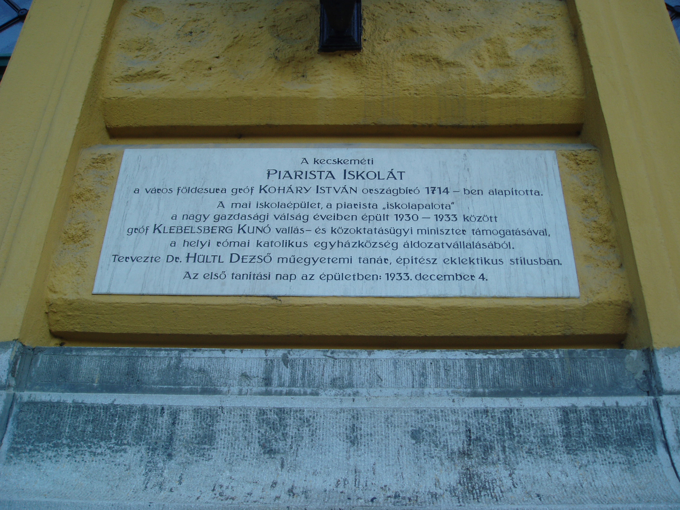Nyilvános 1152 | 1852 | Kecskemét, Piaristák tere 5. | A mai Piarista Gimnázium és Általános Iskola a nagy múltú régi iskola (lásd: Kecskemét, Jókai u. 1.) közelében 1930 körül épült Hütl Dezső tervei alapján a hajdani főreáliskola helyére. A klasszicizáló huszártoronnyal díszített kétemeletes, monumentális iskolaépület homlokzati frontján Bory Jenő allegorikus szobrai láthatók. Mindkettőnek Kalazanci Szent József a főalakja. A fénykép 2006 augusztusában készült. Felh. irod.: Heltai Nándor: Kecskemét. Kecskeméti Lapok, 1998 |