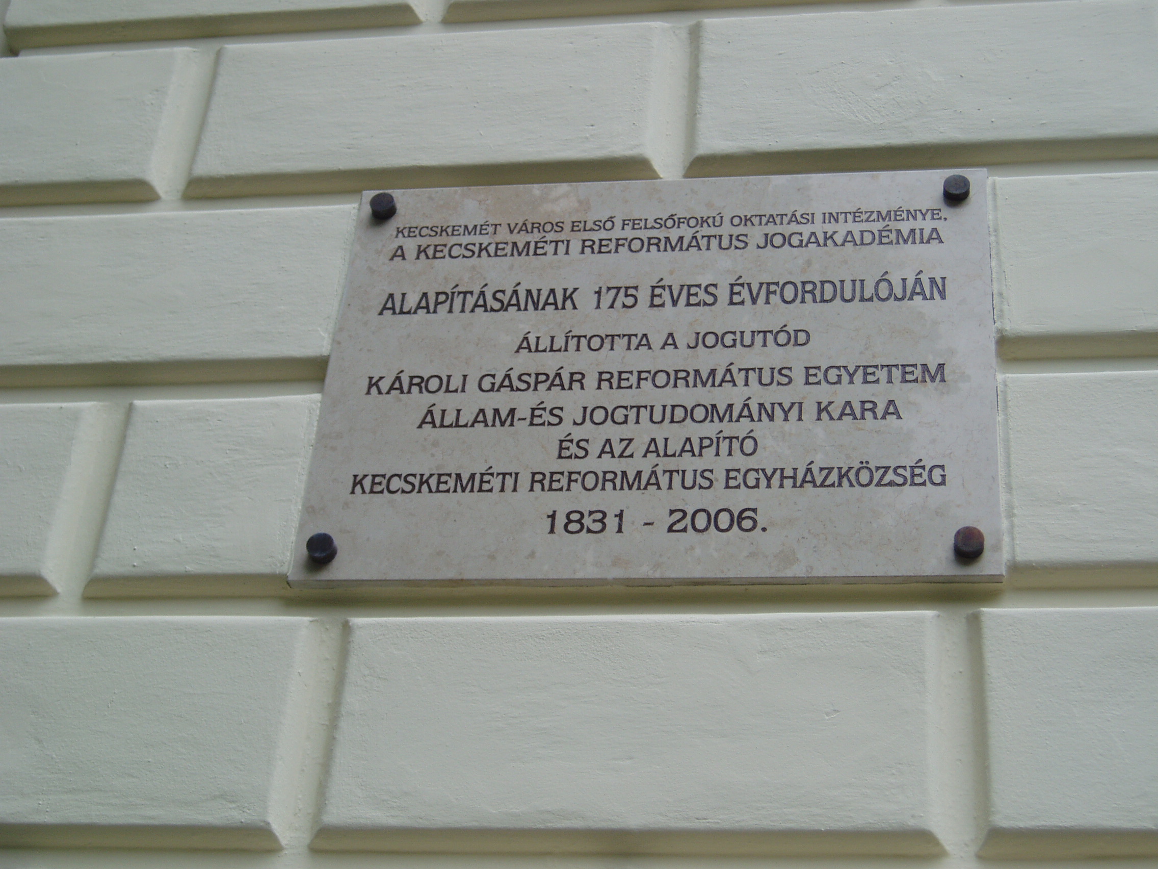 Nyilvános 1154 | 1694 | Kecskemét, Kálvin tér 1. Ókollégium | A monumentális Ókollégium, a volt jogakadémia a XIX. század elején épült klasszicista stílusban Hofrichter József tervei szerint. Kiváló diákja volt 1842-44-ben Jókai Mór, akit ebben az épületben Petőfi is meglátogatott, amikor egy vándor színtársulat tagjaként Kecskeméten időzött. Ma itt működik a Károlyi Gáspár Református Egyetem Állam- és Jogtudományi Kara, és itt kapott helyet a Ráday Múzeum. A fénykép 2006 augusztusában készült. Felh. irod.: Heltai Nándor: Kecskemét. Kecskeméti Lapok, 1998 |