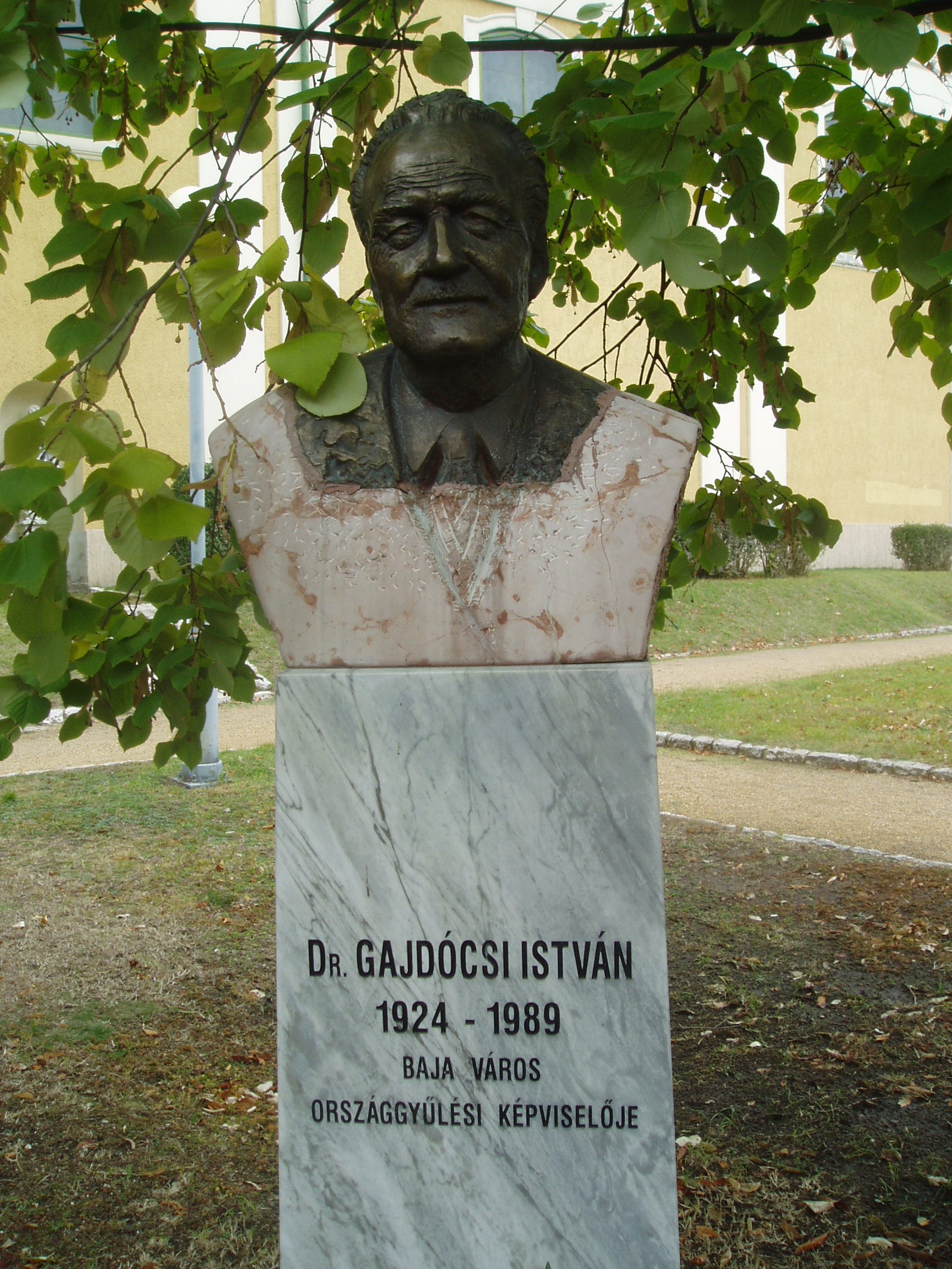 Nyilvános 1454 | 3184 | Baja, Bartók Béla utca 1-3. Páduai Szent Antal ferences kolostortemplom és rendház | Baja központjában áll az egykori ferences rendház, s hozzá tapadva a kolostortemplom, más néven Barátok temploma. A templom déli oldalán levő parkban híres bajai személyiségek mellszobrait állították fel. Itt áll Gajdócsi István mellszobra is, aki a Kádár-korszakban Bács-Kiskun megye tanácselnöke és Baja országgyűlési képviselője volt, s a térség kulturális és művészeti életét jelentősen támogatta. A fénykép 2007 októberében készült. Felh. irod.: Látnivalók Bács-Kiskun megyében. Miskolc, Well-PRess, 2002 www.wikipedia.org |
