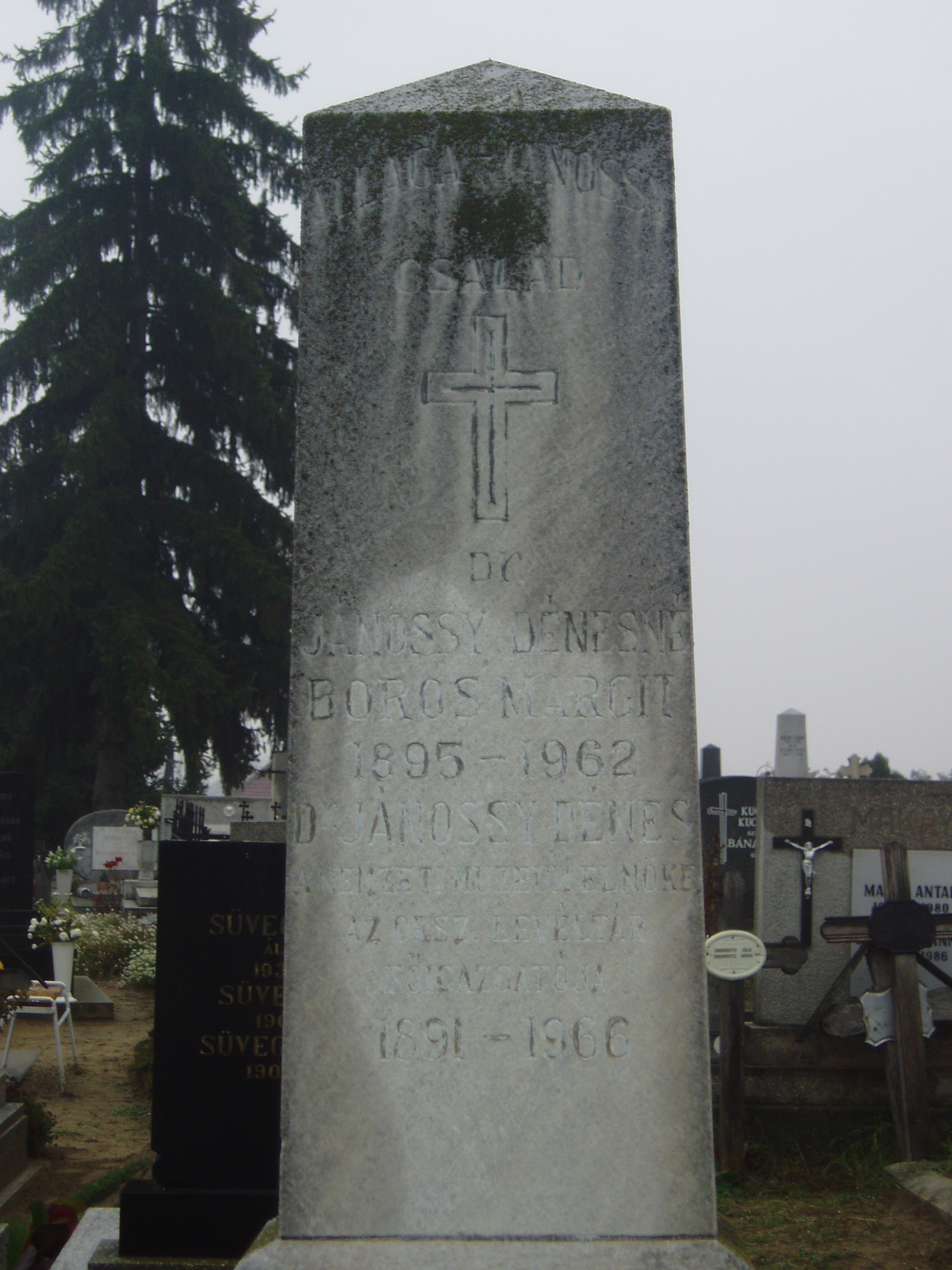 Nyilvános 1150 | 1918 | Baja, Rókus utca: Rókus temető - Jánossy Dénes sírja | A temetőkápolna közelében, Allaga Géza zeneszerzővel közös sírban nyugszik a rokonsághoz tartozó Jánossy Dénes (1891-1966) levéltáros, az MTA levelező tagja. Elsősorban a XIX. század politikai történetével, különösen a Kossuth-emigrációval foglalkozott. A fénykép 2007 októberében készült. Felh. irod.: Magyar életrajzi lexikon |