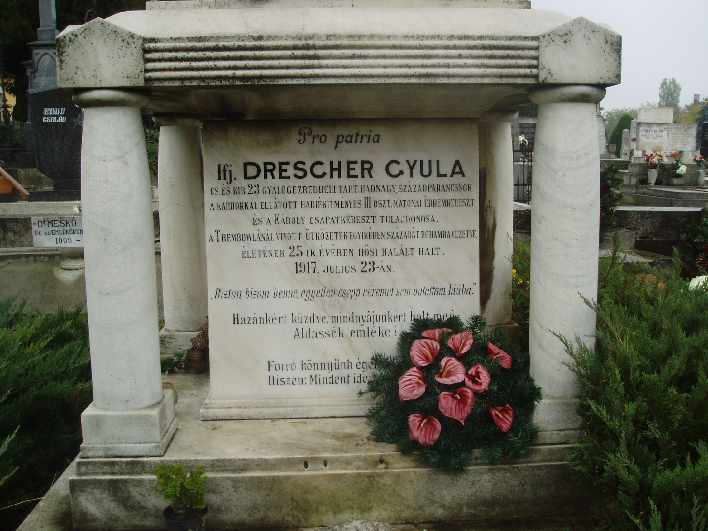 Nyilvános 1129 | 2186 | Baja, Rókus utva: Rókus temető - Drescher Gyula sírja | Itt nyugszik ifj. Drescher Gyula, a 23. gyalogezred tartalékos hadnagya, századparancsnok. Hősi halált halt életének 25. évében, 1917. november 23-án. A fénykép 2007 októberében készült. |
