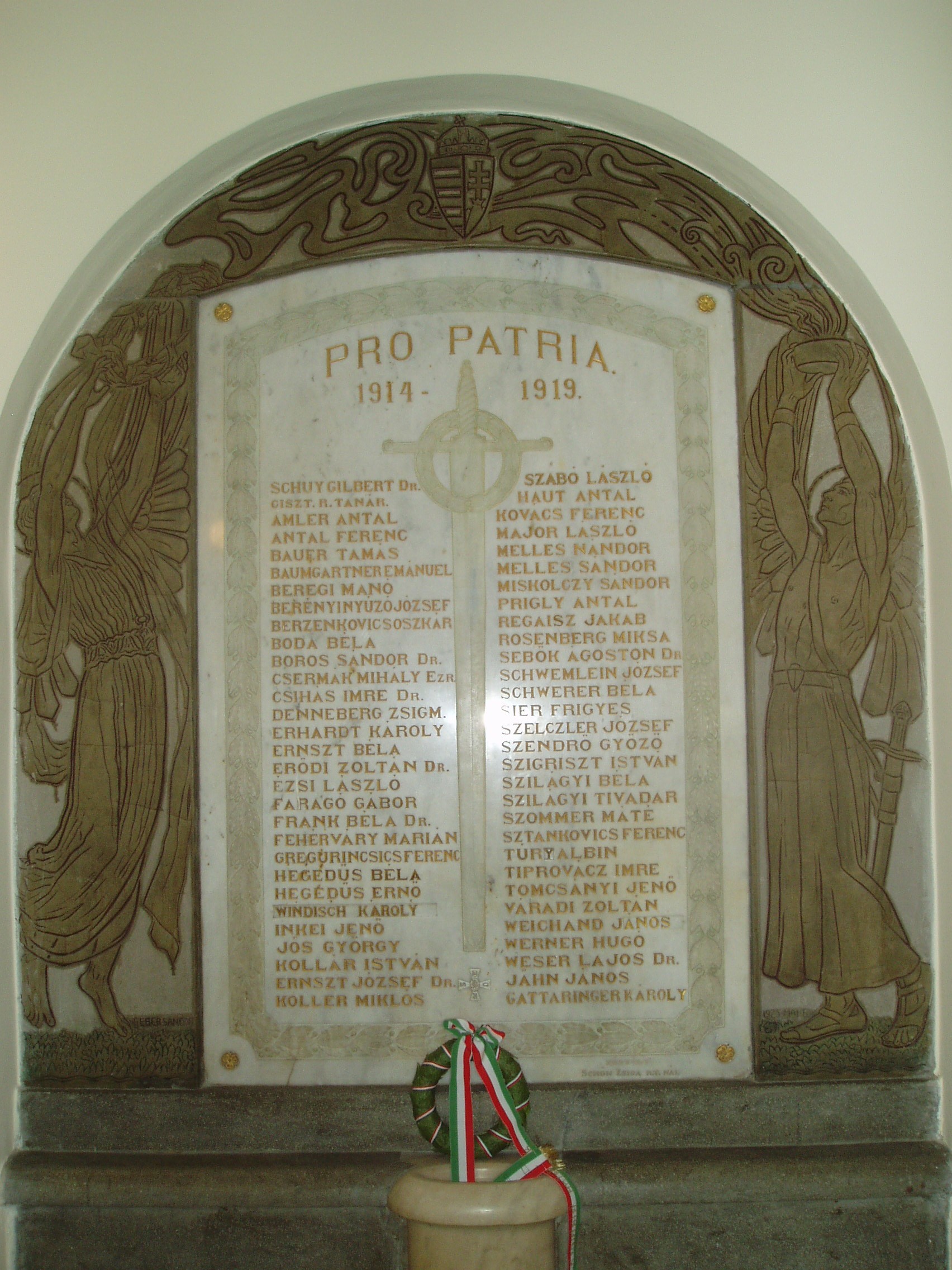 Nyilvános 1122 | 1605 | Baja, Szent Imre tér 5. III. Béla Gimnázium | Az 1925-ben felállított első világháborús emléktáblát körülvevő sgrafittót ifj. Éber Sándor bajai születésű képzőművész készítette. Az 1757-ben alapított iskola mai épületét 1815-ben emelték, majd 1892-ben és 1931-ben jelentősen bővítették, alakították. Korábban a közelben ma is álló ferences kolostorban (lásd: Baja, Bartók B. u. 1-3.) folyt a tanítás. Az intézmény a ferencesek után 1879-től a ciszterci rendé lett. III. Béla nevét, aki a ciszter rendet letelepítette Magyarországon, az 1921/22-es tanévben vette fel. Ma már szobra is ott áll az épület előtt. 1948 óta állami iskola. Híres növendéke volt Nagy Ignác író (1819–1821), Türr István (1835–1840), Tóth Kálmán költő (1839–1845), Szarvas Gábor nyelvész (1842–1848). Pályakezdőként az 1905/06-os tanévben itt tanított Babits Mihály. Az iskolának a zenei életben nevet szerzett diákjai is voltak. Ide járt gimnáziumba az 1902/03-as tanévtől nyolc éven át a bajai születésű Kun Imre (1892–1977), a legendás hangversenyrendező és az 1940-es évek elején a szintén Baján született Lukin László (1926–2004) zenepedagógus, karnagy. A fénykép 2007 októberében készült. Felh. irod.: Bálint László: A bajai III. Béla Gimnázium. Bp. Tankönyvkiadó, 1989 Történelmi és kegyeleti emlékhelyek. = www.kjmk.hu/emlek |