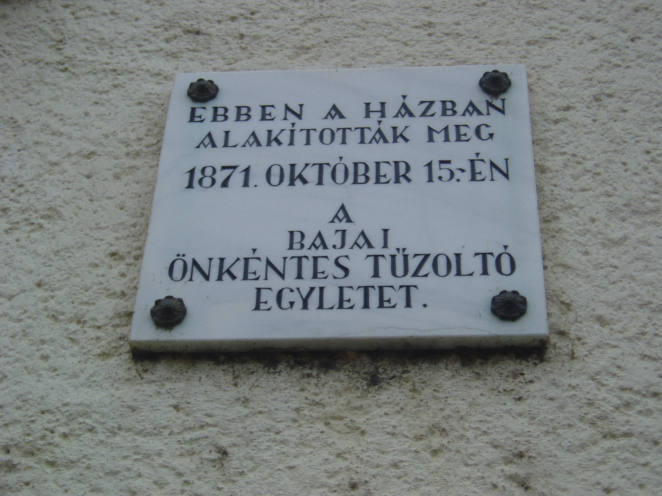 Nyilvános 1149 | 1625 | Baja, Táncsics utca 12. | Mint az épületen elhelyezett emléktáblán is olvasható, ebben a házban alakult meg 1871. október 25-én a bajai Önkéntes Tűzoltó Egylet. Történelme során több nagy tűzvész is pusztított Baján. Az első jelentős, forásokkal is alátámasztott tűz 1742-ben emésztette fel a város nagy részét. Az ezt követő másfél évszázadban több, mint ezerszer lobbant fel a tűz a településen. Nagy tűz volt 1806-ban és 1819-ben, 1840-ben pedig az egész város leégett. A fénykép 2007 októberében készült. Felh. irod.: Gál Zoltán: A bajai tűzoltóság hőskora. = www.bacskaisport.hu |
