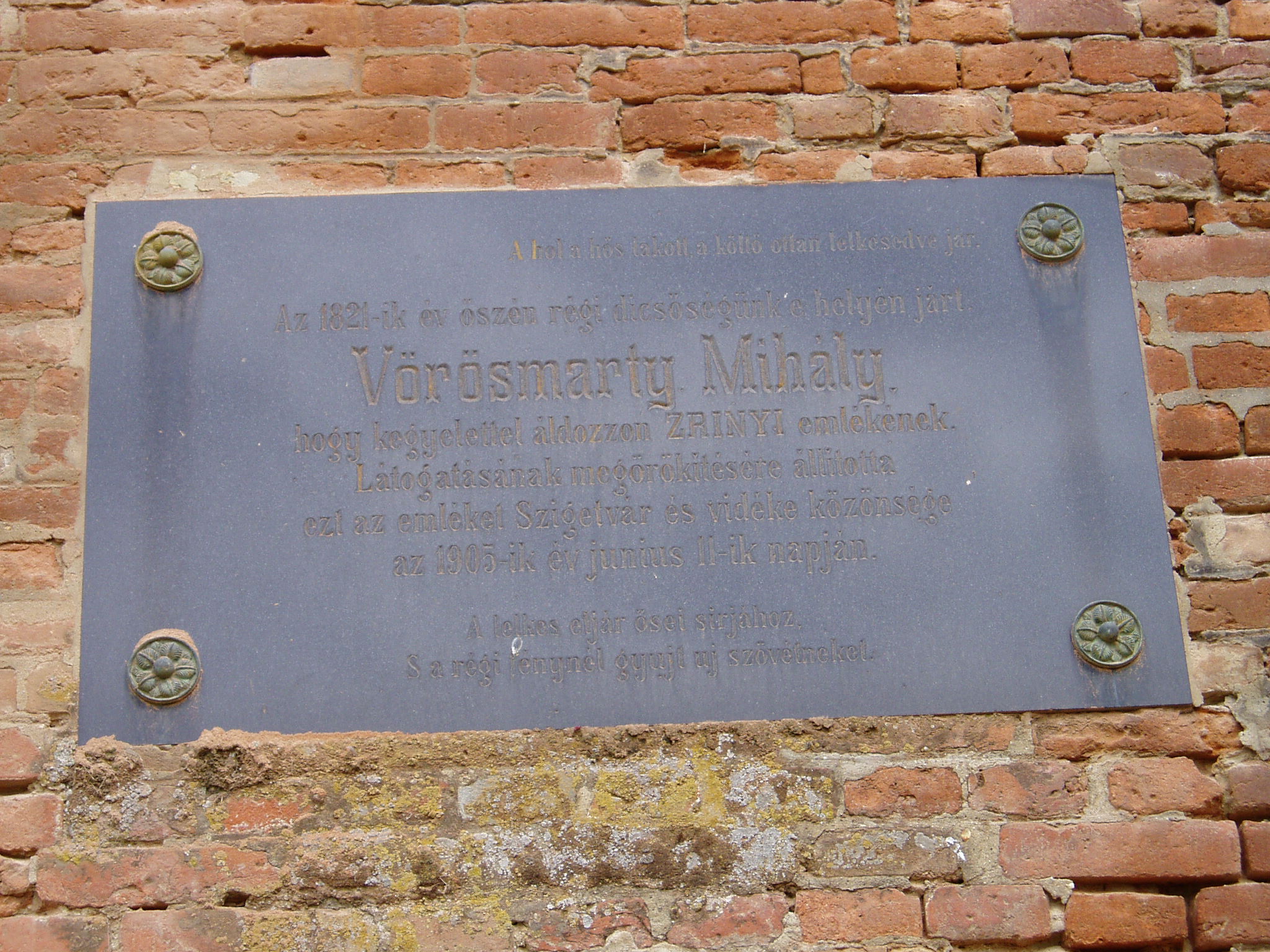 Nyilvános 1217 | 1874 | Szigetvár, Vár: Vörösmarty Mihály emléktáblája | A várban 1905-ben avatták fel Vörösmarty Mihály emléktábláját. A nagy magyar költő itt járt - az emléktábla felirata szerint - 1824 őszén, hogy kegyelettel adózzon Zrínyi Miklós történelmi tette előtt. Szigetvár című versét 1822-ben írta; lehet, hogy az emléktáblán nem pontos az évszám, vagy többször is járt ezen a helyen. Vörösmarty Mihály: Szigetvár Láttam veszélyes tájadat, oh Sziget! Előttem állott roskadozó falad, Előttem a múlt kor csatái S gyászba borúlt ege Hunniának. Itt késve mérgét nyelte az agg török; Itt táboroztak népei dölyfösen, Ott fenn erős, de számra kisded, S győzve fogyó hadaink tanyáztak. S onnan, ha kellett; mint az egek nyila A záporoknak vad zuhanási közt, Csattogva, sujtva, száz halálban Törtek alá rabölő haraggal. Kétszázezerrel víva meg egy marok Népség s vitái győztösek annyiszor, De ah! – borúlj el gyászhozó nap! – A diadal közepett enyésztek. Vagy mely tünő fény leng szemeim felé? A csendes éjnek rémi talán? – Vagy a Fagyos halálnak váza, vagy bús Képe az ősi idők fiának? Oh Zrínyi roncsolt képe, te vagy! Dicső Hős hajdan a vérfergetegek között, Rémítve villogsz most előmbe Századaink sanyarú korából: Duló vasat tart rettenetes karod, Elszánt komolyság terjedez arcodon, Lelkedben a szép hír, boszúság És kitörő harag ég szivedben. Mert vesztegelnek társaid a mezőn, Csatátlanul, rosz, gyáva tanács miatt, Míg téged a veszélyek útán Sírba viszen csapodár szerencse. Te a hazáért halni tudál; dicső! Mi nem tudunk már érte csak élni is; A támadó nap tudja, látja, A szomorún nyugovó, bününket. Mikor szününk meg bor, szerelem között A hon virultát messze felejteni? Mikor kerülhet vissza a künn Elpazarolt arany és dicsőség? Hajh elközelget majd az enyészet így! Eltörli a nép bajnoki tetteit: Megdőlnek a fajult vitézek, Sírjai hős eleik nevének. Börzsöny, 1822 A fénykép 2005 júniusában készült. |