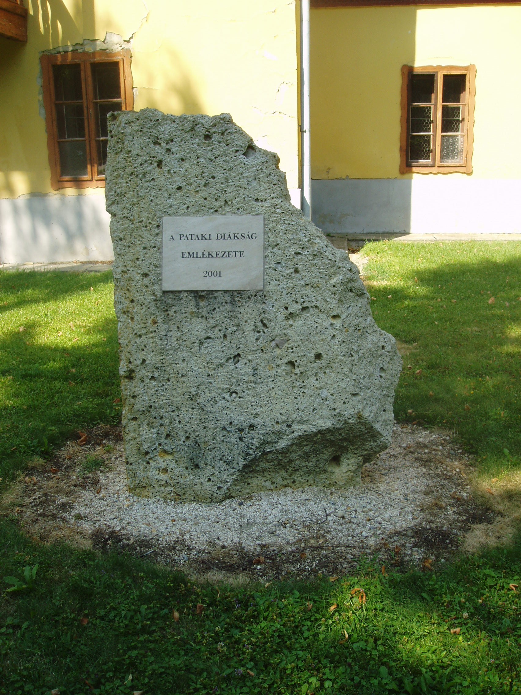Nyilvános 1072 | 1588 | Sárospatak, Iskolakert: A pataki diákok emlékezete | A Református Kollégium (lásd: Sárospatak, Rákóczi u. 1.) bejáratával szemben találjuk az Iskolakertnek nevezett parkot. Az 1980-as években természetvédelmi területté nyilvánított Iskolakert sajátos nemzeti érték, mely egyedülálló az országban. Sétányai mentén Patakhoz kötődő jeles személyiségek szobrai állnak. Az iskolakertben álló műemlék tornacsarnok közelében is elhelyeztek néhány feliratos emlékkövet. A képen a pataki diákság emlékezetére állított kő látható. A fénykép 2007 augusztusában készült. Felh. irod.: Látnivalók Borsod-Abaúj-Zemplén megyében. Miskolc, Well-PRess, 1995 www.sarospatak.hu/nevezetessegek |