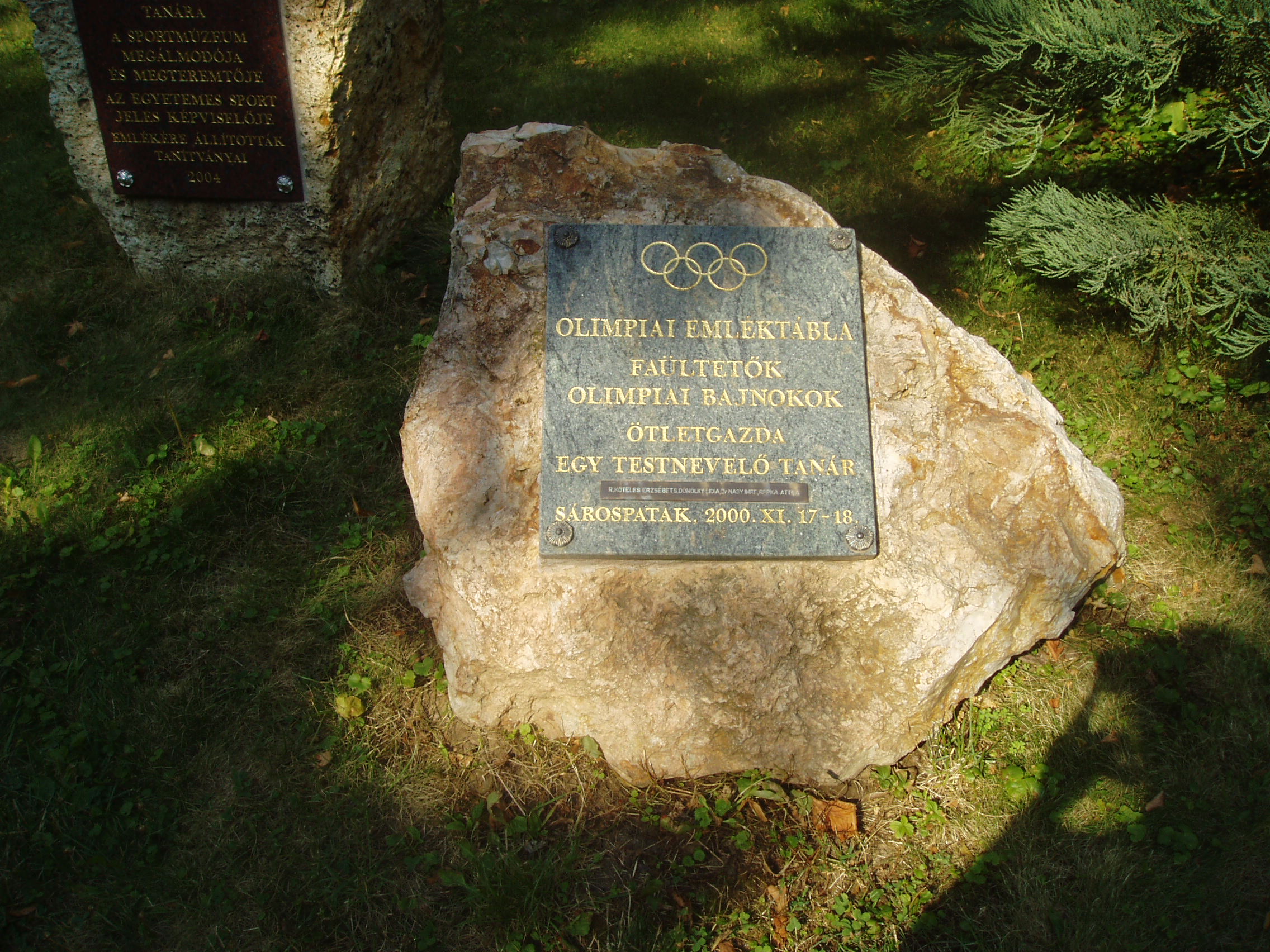 Nyilvános 1090 | 1710 | Sárospatak, Iskolakert: A pataki diákok emlékezete | A Református Kollégium (lásd: Sárospatak, Rákóczi u. 1.) bejáratával szemben találjuk az Iskolakertnek nevezett parkot. Az 1980-as években természetvédelmi területté nyilvánított Iskolakert sajátos nemzeti érték, mely egyedülálló az országban. Sétányai mentén Patakhoz kötődő jeles személyiségek szobrai állnak. Az iskolakertben álló műemlék tornacsarnok közelében is elhelyeztek néhány feliratos emlékkövet. A képen a 2000-ben felállított Olimpiai emléktábla látható. A fénykép 2007 augusztusában készült. Felh. irod.: Látnivalók Borsod-Abaúj-Zemplén megyében. Miskolc, Well-PRess, 1995 |