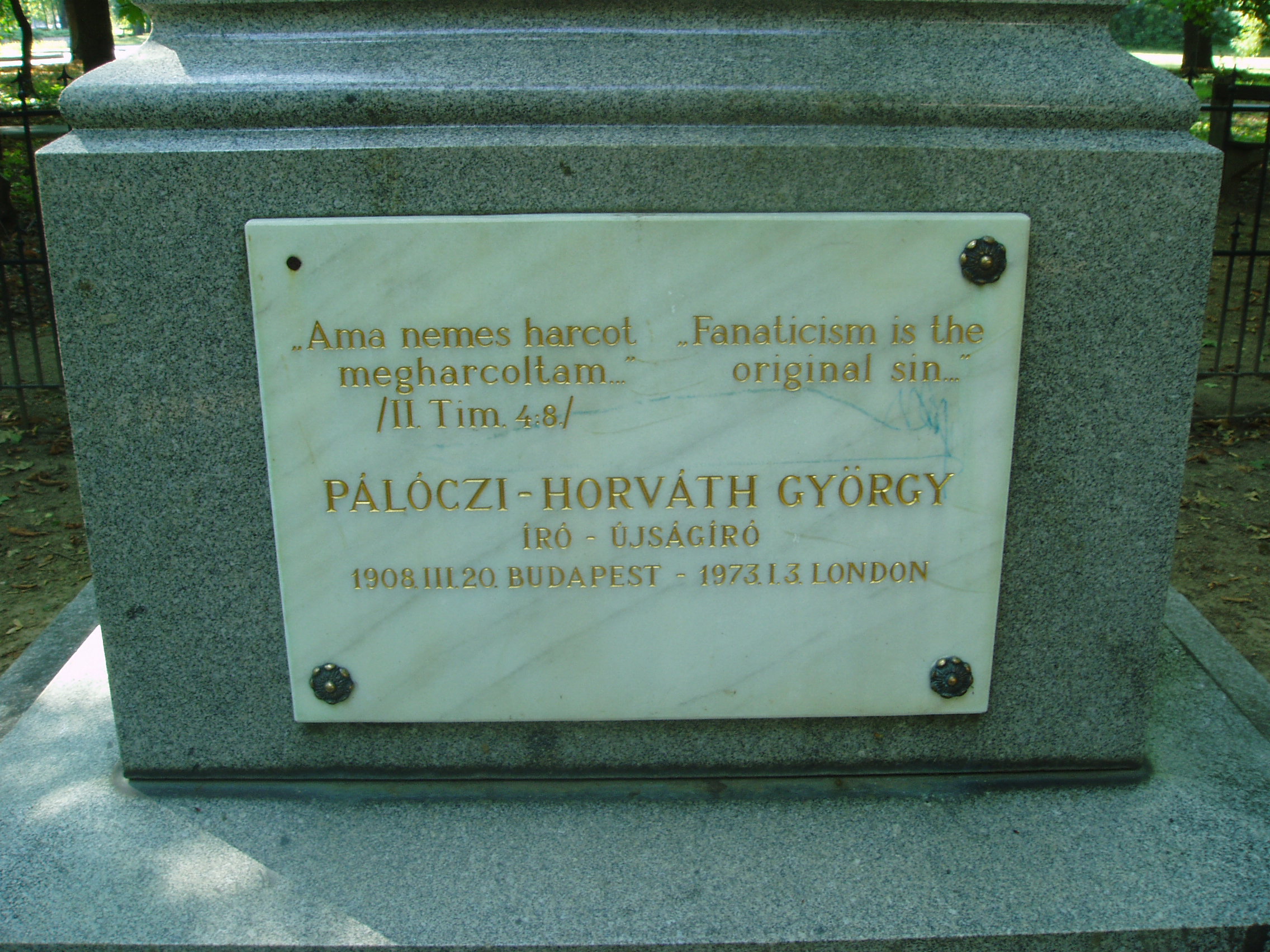 Nyilvános 1086 | 1591 | Sárospatak, Iskolakert: Pálóczi-Horváth-emlékmű | A Református Kollégium (lásd: Sárospatak, Rákóczi u. 1.) bejáratával szemben találjuk az Iskolakertnek nevezett parkot. Az 1980-as években természetvédelmi területté nyilvánított Iskolakert sajátos nemzeti érték, mely egyedülálló az országban. Sétányai mentén Patakhoz kötődő jeles személyiségek szobrai állnak. 1870 körül avatták fel az Iskolakertben a Pálóczi-Horváth-testvérek emlékművét. Készítője báró Vay Miklós főiskolai gondnok, szobrászművész. A rendszerváltás után itt helyezték el Pálóczi-Horváth György (1908-1973) emléktábláját (a család leszármazottja lehetett, de erre nem találtam bizonyítékot - K.K.). Az író, újságíró fordulatos életpályát futott be. Évekig élt az Egyesült Államokban, majd hazatért rövid időre, s a Pesti Napló szerkesztőségében dolgozott. Az 1930-as évek végén ismét elutazott, és Angliában telepedett le, s az angol külügyi szolgálat kötelékébe került. Isztambulban angol összekötőként ő tárgyalt a Kállay-kormány által kiküldöttekkel, akik a kormányfő megbízásából Magyarország háborúból való kiugrását készítették elő. A háború után hazatért Budapestre, s belépett a kommunista pártba. Felelős szerkesztője lett a Tovább című pártlapnak, vezette a Magyar Rádió idegen nyelvű osztályát, majd a Hungária Könyvkiadó irodalmi vezetője lett. Megválasztották a magyar ENSZ-társaság főtitkárává. 1949-ben koholt vádak alapján letartóztatták, öt évet töltött börtönben. 1954-ben rehabilitálták, 1956 végén elhagyta Magyarországot és Londonban telepedett le. Magyar nyelvű írásai főleg a londoni Irodalmi Újságban jelentek meg, amelynek főmunkatársa volt. Visszaemlékezéseit "Elveszett nemzedék" címmel írta meg. Kitűnő műfordító is volt. Londonban hunyt el 1973-ban. A fénykép 2007 augusztusában készült. Felh. irod.: Látnivalók Borsod-Abaúj-Zemplén megyében. Miskolc, Well-PRess, 1995 www.sarospatak.hu/nevezetessegek Magyar életrajzi lexikon Rainer M. János: Esetek a magyar hírszerzés történetéből, 1957-1967. = Rubikon 2002. június-július |