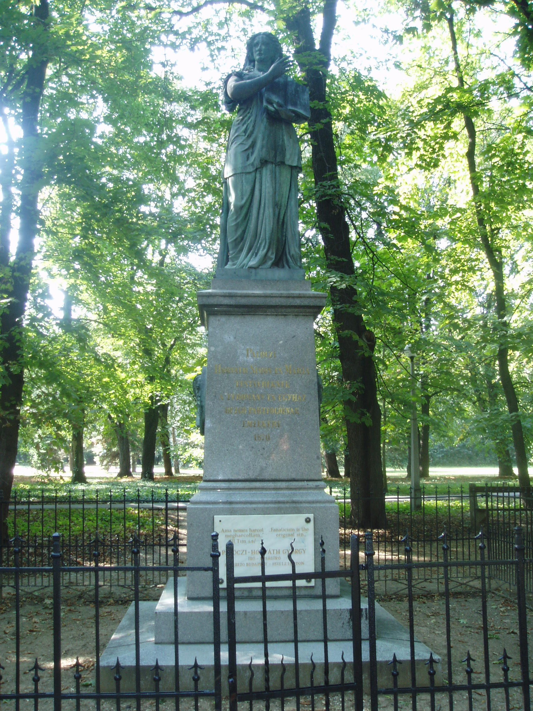 Nyilvános 1123 | 1703 | Sárospatak, Iskolakert: Pálóczi-Horváth-emlékmű | A Református Kollégium (lásd: Sárospatak, Rákóczi u. 1.) bejáratával szemben találjuk az Iskolakertnek nevezett parkot. Az 1980-as években természetvédelmi területté nyilvánított Iskolakert sajátos nemzeti érték, mely egyedülálló az országban. Sétányai mentén Patakhoz kötődő jeles személyiségek szobrai állnak. 1870 körül avatták fel az Iskolakertben a Pálóczi-Horváth-testvérek emlékművét. Készítője báró Vay Miklós főiskolai gondnok, szobrászművész. Az álló alakos nő a tudomány múzsája, bal kezében nyitott könyv, benne Bacon-idézet: ”A tudomány hatalom.” Pálóczi-Horváth Simon és testvére, Mária a XIX. század második felében jelentős összegekkel támogatta a református kollégiumot. Az emléművet portrédomborművük díszíti. A fénykép 2007 augusztusában készült. Felh. irod.: Látnivalók Borsod-Abaúj-Zemplén megyében. Miskolc, Well-PRess, 1995 www.sarospatak.hu/nevezetessegek |