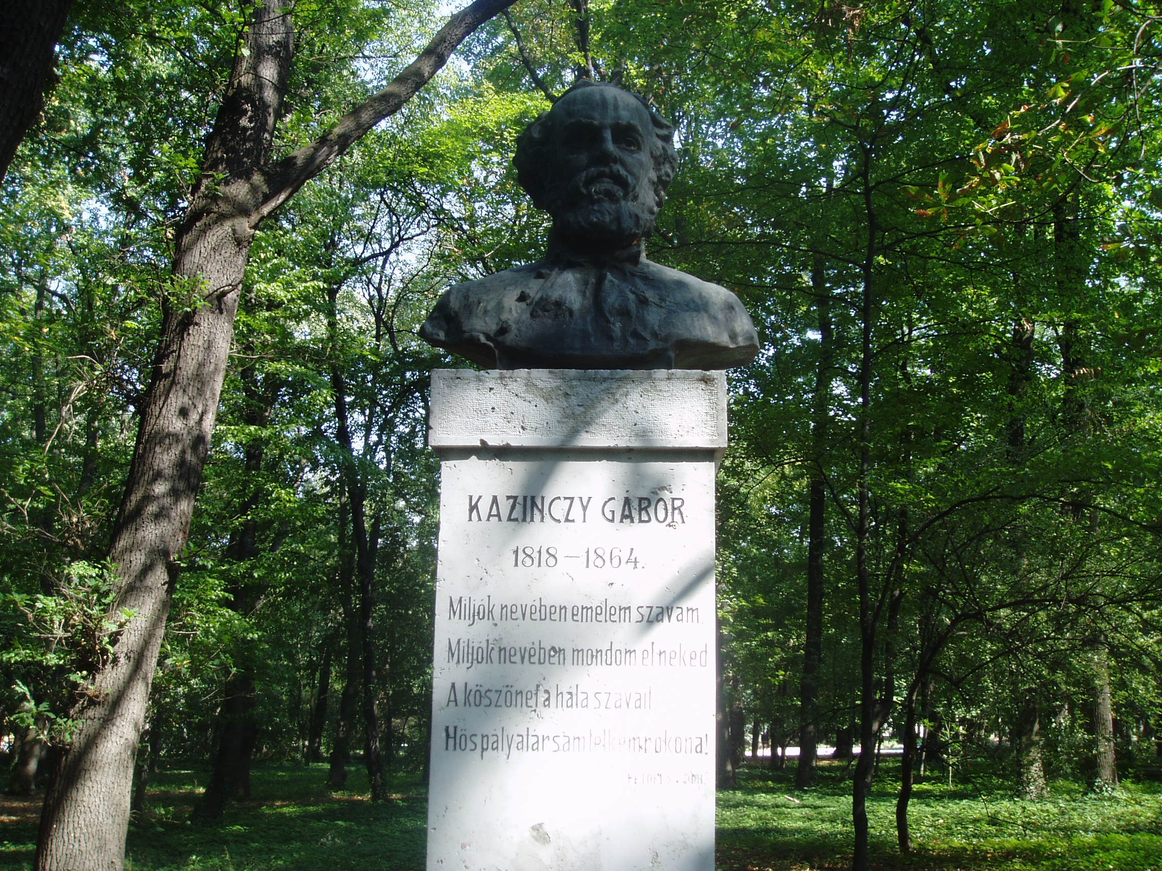 Nyilvános 1138 | 1842 | Sárospatak, Iskolakert: Kazinczy Gábor szobra | A Református Kollégium (lásd: Sárospatak, Rákóczi u. 1.) bejáratával szemben találjuk az Iskolakertnek nevezett parkot. Az 1980-as években természetvédelmi területté nyilvánított Iskolakert sajátos nemzeti érték, mely egyedülálló az országban. Sétányai mentén Patakhoz kötődő jeles személyiségek szobrai állnak. Kazinczy Gábor (1818-1864) bronz mellszobrát, Maugsch Gyula alkotását 1937-ben avatták fel a Kossuth Kollégiumhoz vezető út jobb oldalán. Nagybátyja, Kazinczy Ferenc példáján felbuzdulva már tizenhárom éves korában elhatározta, hogy író lesz. Népbarát című lapja köré egész írókör tömörült. Későbbi életében már a politika játszotta a vezető szerepet: a reformellenzék egyik legnépszerűbb alakja volt. Szónoki tehetsége, melyet Petőfi is magasztalt, kortársai véleménye szerint Kossuthéval vetekedett. A szabadságharc bukása után hazája sorsa felett kétségbeesve a Borsod megyei Bánfalván húzódott meg, és csak 1861-ben lépett újra a nyilvánosság elé élete egyik legnagyobb hatású országgyűlési beszédével, majd reményeiben csalatkozva újra és most már véglegesen eltemetkezett magányába. A fénykép 2007 augusztusában készült. Felh. irod.: Látnivalók Borsod-Abaúj-Zemplén megyében. Miskolc, Well-PRess, 1995 www.sarospatak.hu/nevezetessegek A magyar irodalom története 3. kötet. Szerk. Sőtér István. Bp. Akadémiai Kiadó, 1965 |