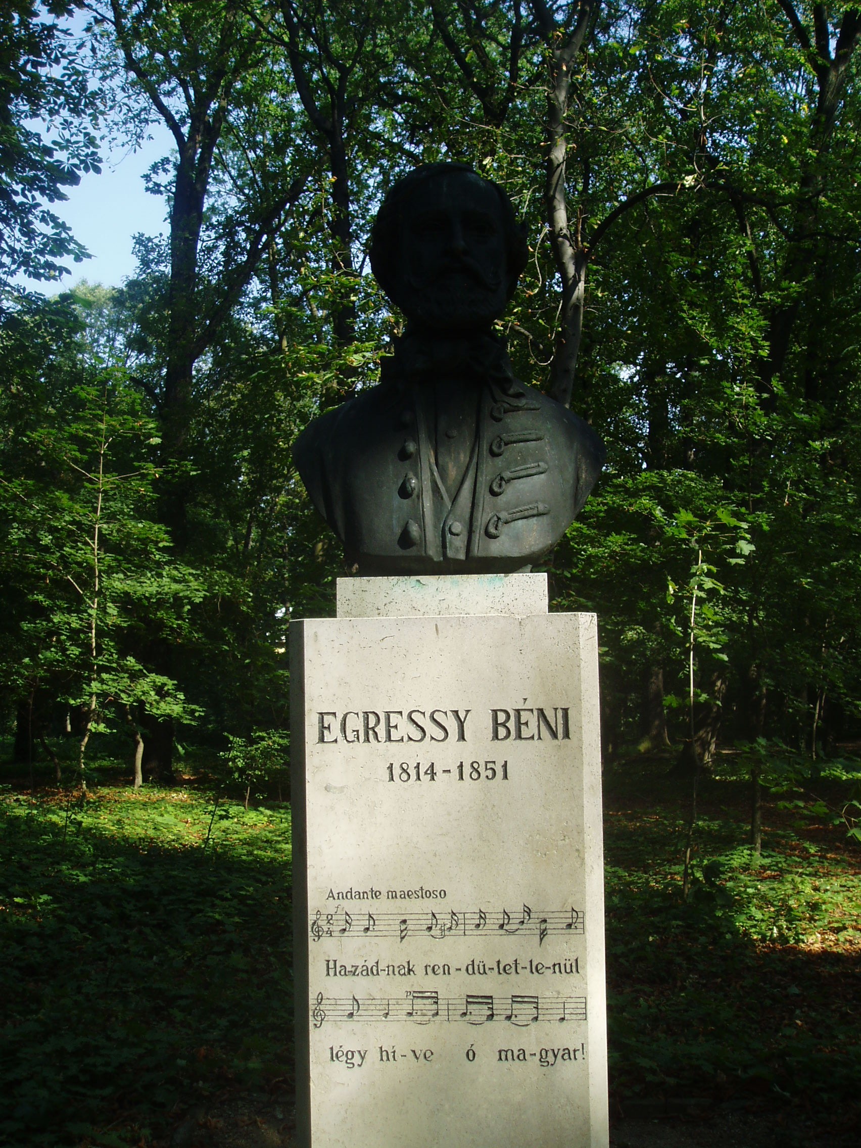 Nyilvános 1500 | 3721 | Sárospatak, Iskolakert: Egressy Béni szobra | A Református Kollégium (lásd: Sárospatak, Rákóczi u. 1.) bejáratával szemben találjuk az Iskolakertnek nevezett parkot. Az 1980-as években természetvédelmi területté nyilvánított Iskolakert sajátos nemzeti érték, mely egyedülálló az országban. Sétányai mentén Patakhoz kötődő jeles személyiségek szobrai állnak. A képen Egressy Béni bronz mellszobra látható. Kelemen Kristóf alkotását 1989-ben, a Szózat zeneszerzője születésének 175. évfordulója alkalmából avatták fel. Talapzatán hangjegyekkel és szöveggel a Szózat első két sora látható. Egressy Béni 1828–1831 között volt a kollégium diákja. Szobrának felállítását Béres Ferenc (1922–1996) énekművész kezdeményezte; ma már az ő szobra is az Iskolakertben áll, ugyanezen az oldalon. A fénykép 2007 augusztusában készült. Felh. irod.: Látnivalók Borsod-Abaúj-Zemplén megyében. Miskolc, Well-PRess, 1995 www.sarospatak.hu/nevezetessegek |