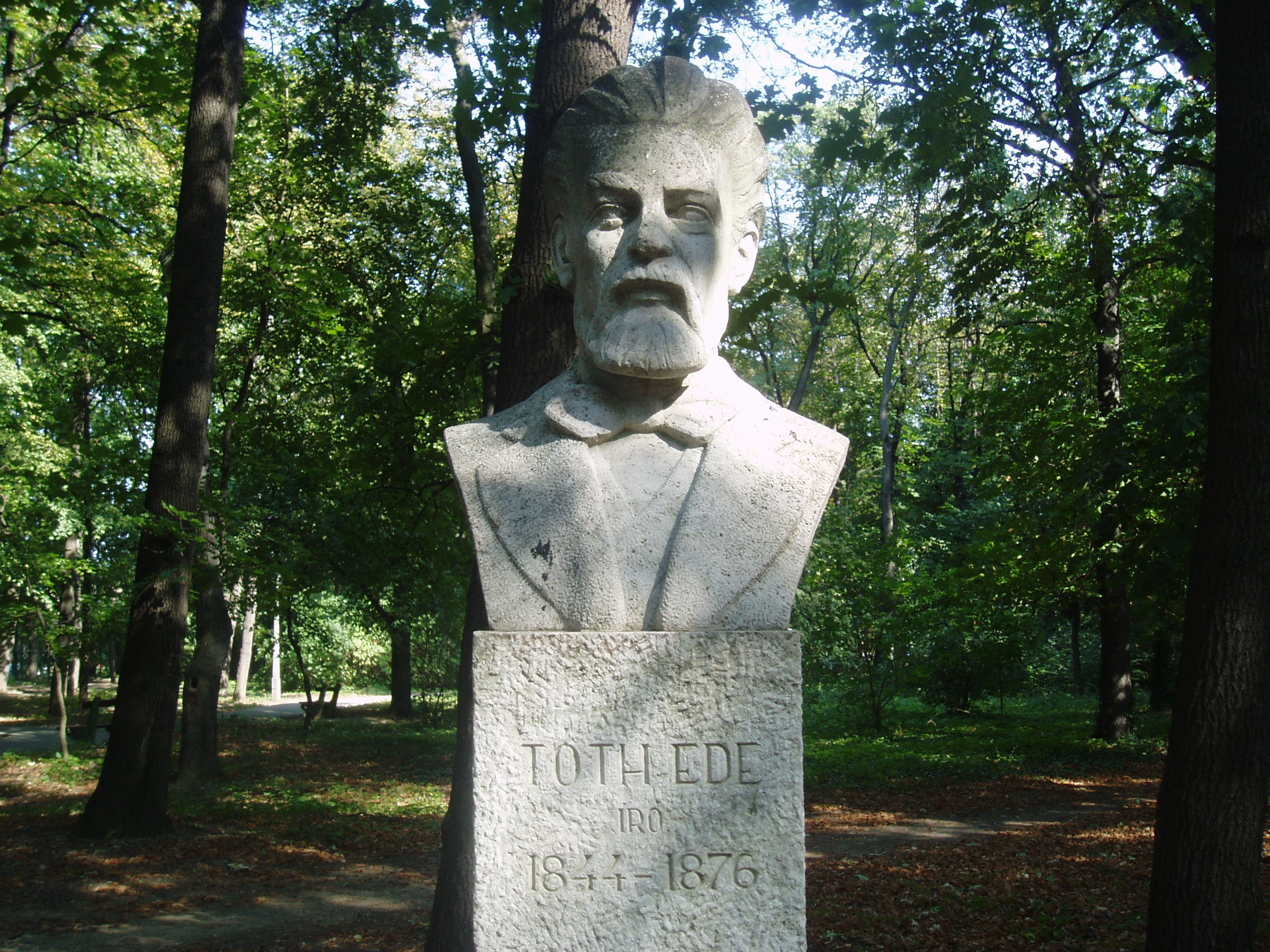 Nyilvános 1142 | 2148 | Sárospatak, Iskolakert: Tóth Ede szobra | A Református Kollégium (lásd: Sárospatak, Rákóczi u. 1.) bejáratával szemben találjuk az Iskolakertnek nevezett parkot. Az 1980-as években természetvédelmi területté nyilvánított Iskolakert sajátos nemzeti érték, mely egyedülálló az országban. Sétányai mentén Patakhoz kötődő jeles személyiségek szobrai állnak. Tóth Ede (1844-1876) író kőből faragott mellszobra Ugray György alkotása (1972). Az egykori pataki diák sok nyomorgás után, iskoláit abbahagyva 1864-ben vándorszínésznek állt. Éveken át rendületlenül próbálkozott az írással, de tehetségét addig nem fedezték fel, míg 1874-ben meg nem írta "A falu rossza" című színművét, mellyel elnyerte a 100 arany értékű Nemzeti Színház 100 arany értékű pályadíját, s egy csapásra híressé vált. A sok nélkülözés azonban annyira megrongálta egészségét, hogy tüdőbaján már nem lehetett segíteni. Rövid munkásságával is új lendületet tudott adni a népszínműnek. A fénykép 2007 augusztusában készült. Felh. irod.: Látnivalók Borsod-Abaúj-Zemplén megyében. Miskolc, Well-PRess, 1995 www.sarospatak.hu/nevezetessegek Magyar életrajzi lexikon |