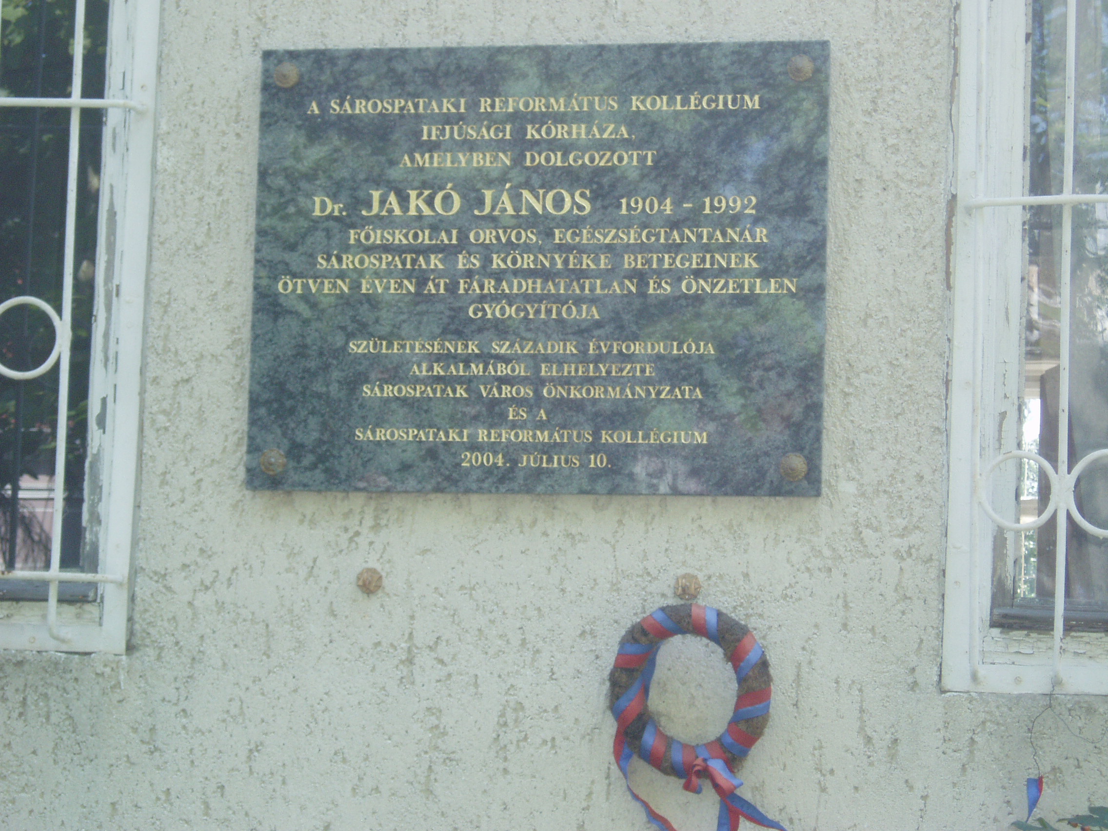 Nyilvános 1091 | 1797 | Sárospatak, Kazinczy utca 25. | A ma kollégiumként működő épületben egykor a Református Kollégium ifjúsági kórháza működött. Itt dolgozott Dr. Jakó János (1904-1992) iskolaorvos, egészségtanár. A kis kórházat 1937-ben az ő intenciói alapján élpítették fel. 1952 után körzeti orvosként gyógyította fáradhatatlanul és önzetlenül a környék betegeit. Emléktábláját 2004-ben, születése 100. évfordulója alkalmából állították. A fénykép 2007 augusztusában készült. Felh. irod.: Száz éve született dr. Jakó János. = Sárospataki Református Lapok 2004. 3. |
