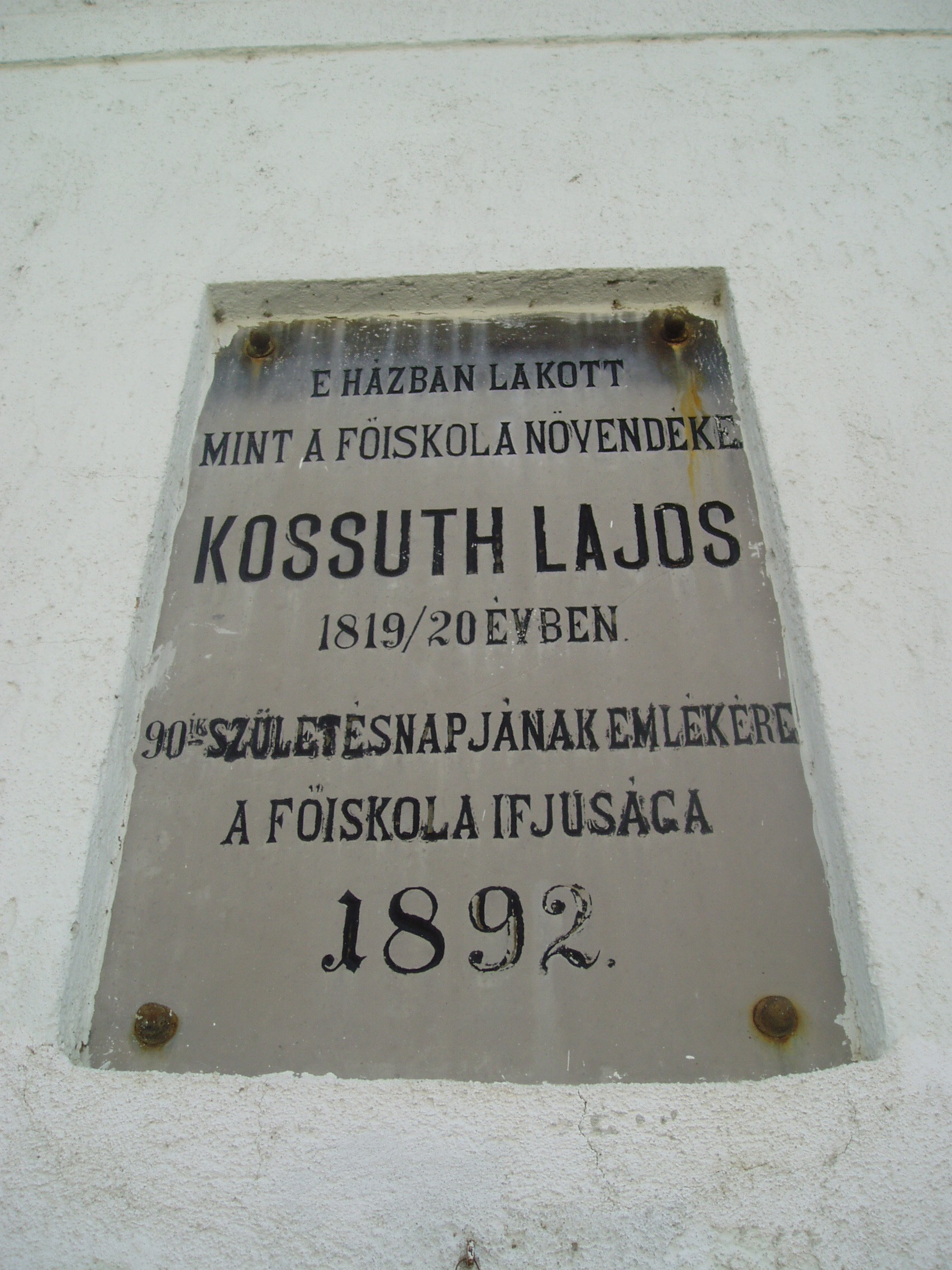 Nyilvános 1074 | 1732 | Sárospatak, Kossuth utca 43. | Mint az épület homlokzatán Kossuth Lajos születésének 90. évfordulója alkalmából elhelyezett emléktáblán is olvasható, ebben a házban lakott a nagy államférfi, amikor az 1819/20-as tanévben a Református Kollégium (lásd: Sárospatak, Rákóczi u. 1.) diákja volt. A fénykép 2007 augusztusában készült. |