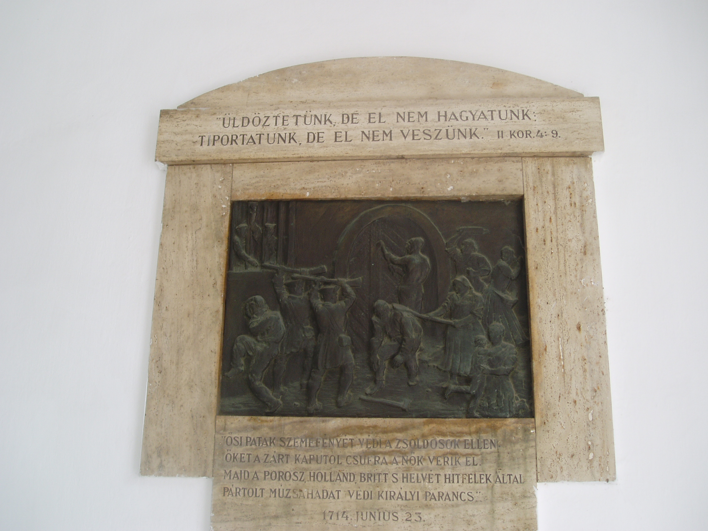 Nyilvános 1064 | 1574 | Sárospatak, Rákóczi utca 1. Református Kollégium | A kollégium főépülete, a Nagy Kollégium a Rákóczi út északi végén található, mely 1804–1814 között korai klasszicista stílusban épült. Szép ráccsal ellátott, háromíves nyílású kapuzat vezet be az un. „nagyportá”-ba, amelyet két sor vaskos pillér három hajóra oszt. Kétoldalt a falakon az iskolatörténet néhány fontosabb eseményének, illetve a kollégium nagy alakjainak bronz domborművű ábrázolásait helyezték el. A képen a Kollégium megvédésének emléktáblája látható (Szabados Béla alkotása, 1939). Felirata szerint 1714-ben, a Rákóczi-szabadságharc bukása után, amikor Patak a császáriak kezébe került, nők védték meg a Kollégiumot a zsákmányra vágyó zsoldoskatonákkal szemben. A fénykép 2007 augusztusában készült. Felh. irod.: Détsy Mihály: Sárospatak. Bp. Corvina, 1974 Látnivalók Borsod-Abaúj-Zemplén megyében. Miskolc, Well-PRess, 1995 www.sarospatak.hu/nevezetessegek |