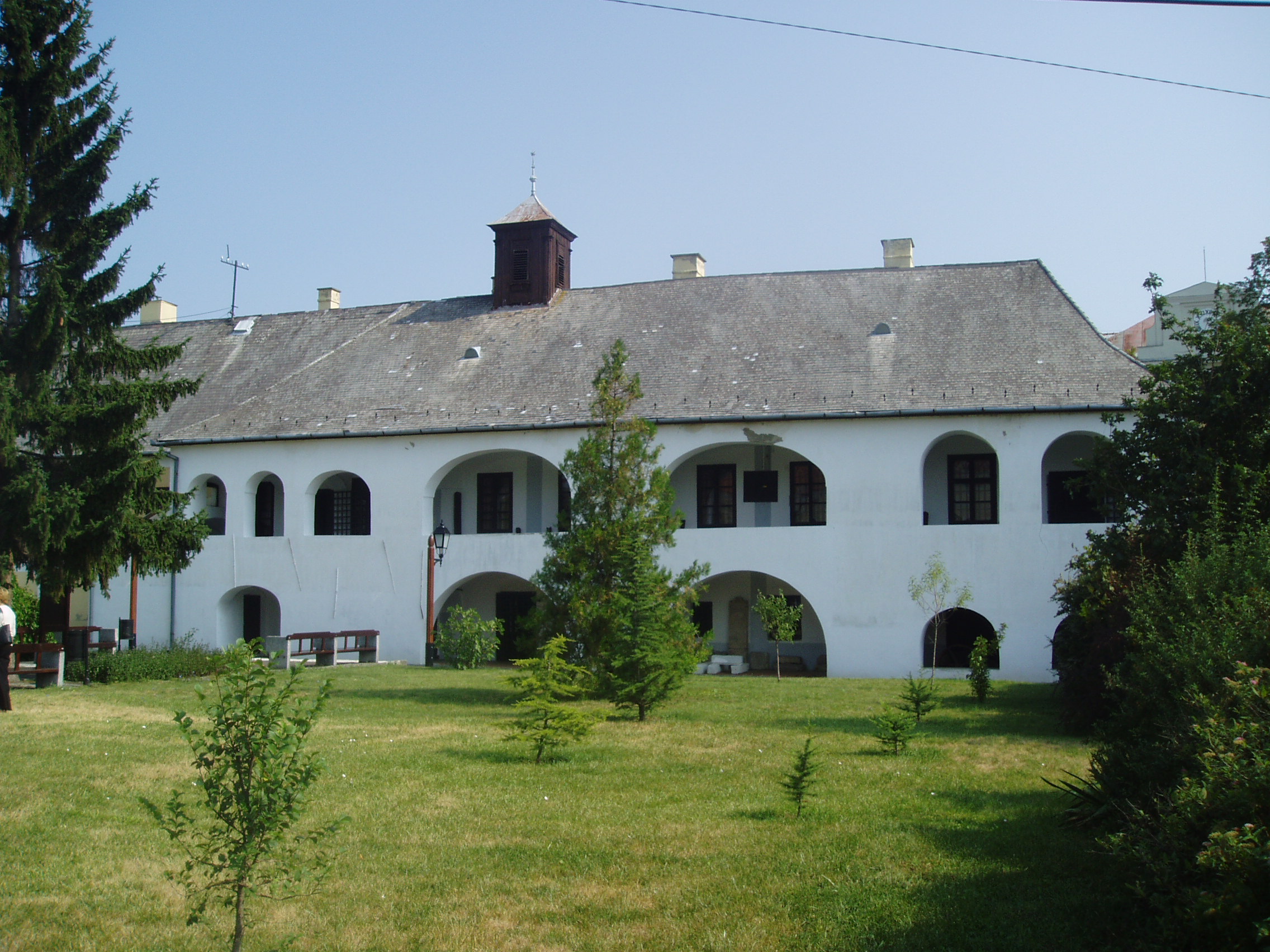 Nyilvános 1051 | 1588 | Sárospatak, Rákóczi utca 1. Református Kollégium | A Kollégium főépületének szárnyai által határolt tágas udvarban áll a régi iskolaépületek utolsó maradványa, az ún. Berna-sor. 1771/72-ben a fizika oktatása számára és a fizikaprofesszor lakásául épült. Az egyemeletes, hosszú szárny déli oldalát később kétszintes, árkádos tornáccal bővítették, feljáróval a nyugati oldalon. Az épület a korabeli provinciális magyar építészet szép példája. Az emelet boltozott termeiben a kollégium történetét bemutató kiállítás látható. A fénykép 2007 augusztusában készült. Felh. irod.: Détsy Mihály: Sárospatak. Bp. Corvina, 1974 |