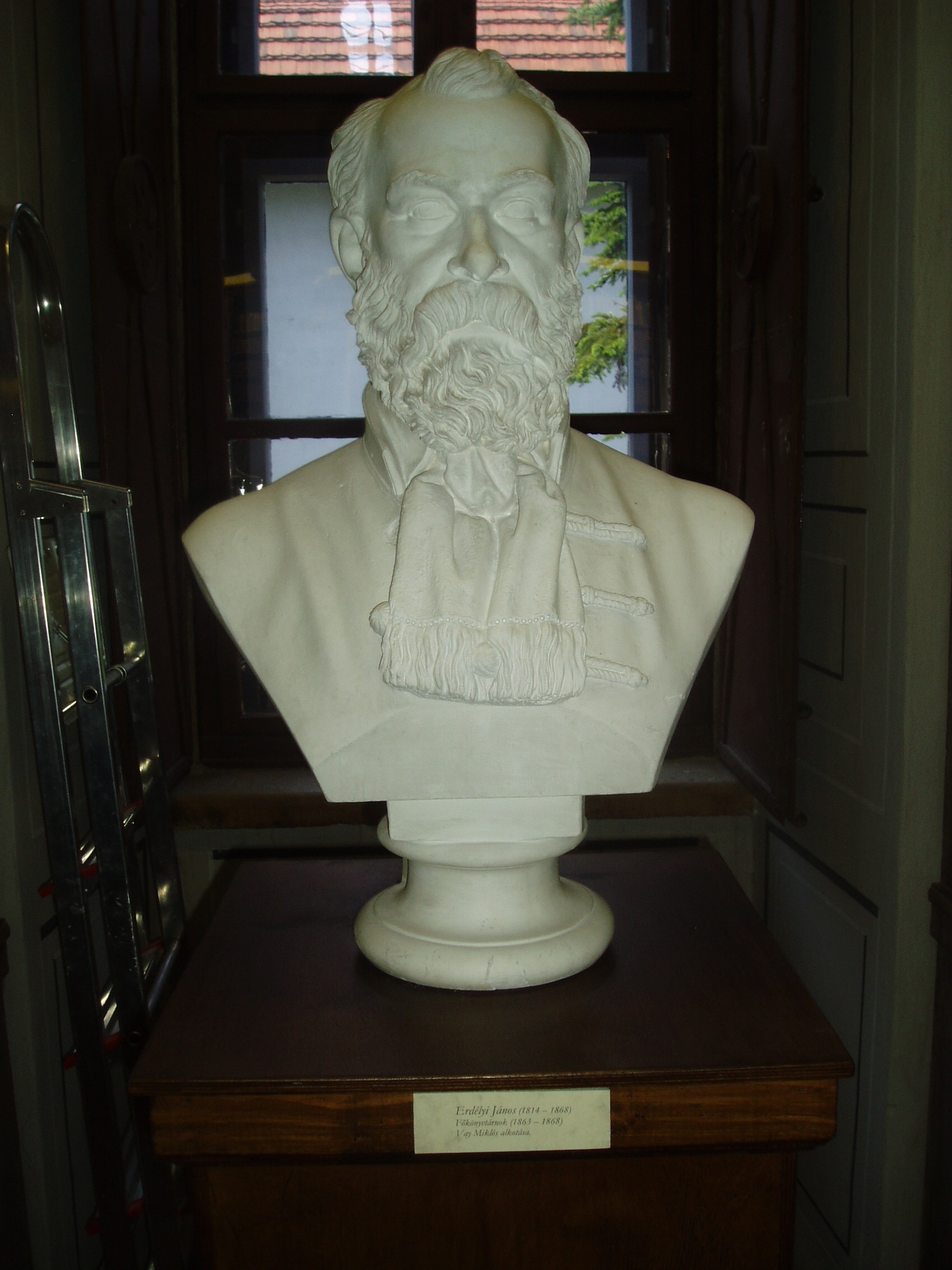 Nyilvános 1080 | 1539 | Sárospatak, Rákóczi utca 1. Református Kollégium könyvtára | Erdélyi János (1814-1868) költő, kritikus, esztéta, filozófus, tanár mellszobra Vay Miklós alkotása. Erdélyit, miután 1848/49-ben a Nemzeti Színház igazgatója volt, s Világos után üldöztetéseknek volt kitéve, 1851-ben meghívták a sárospataki főiskola bölcseleti tanszékére. 1863-tól a kollégium "könyvtárnoka" lett, ezzel együtt a magyar irodalmi tanszéket foglalta el. Nagyszabású könyvtári terveiből egyedül az állomány szak szerinti elrendezését tudta korai halála előtt megvalósítani. Munkáját utódja, Szinyei Gerzson fejezte be. A fénykép 2007 augusztusában készült. Felh. irod.: www.gradatio.hu/nagykonyvtar |