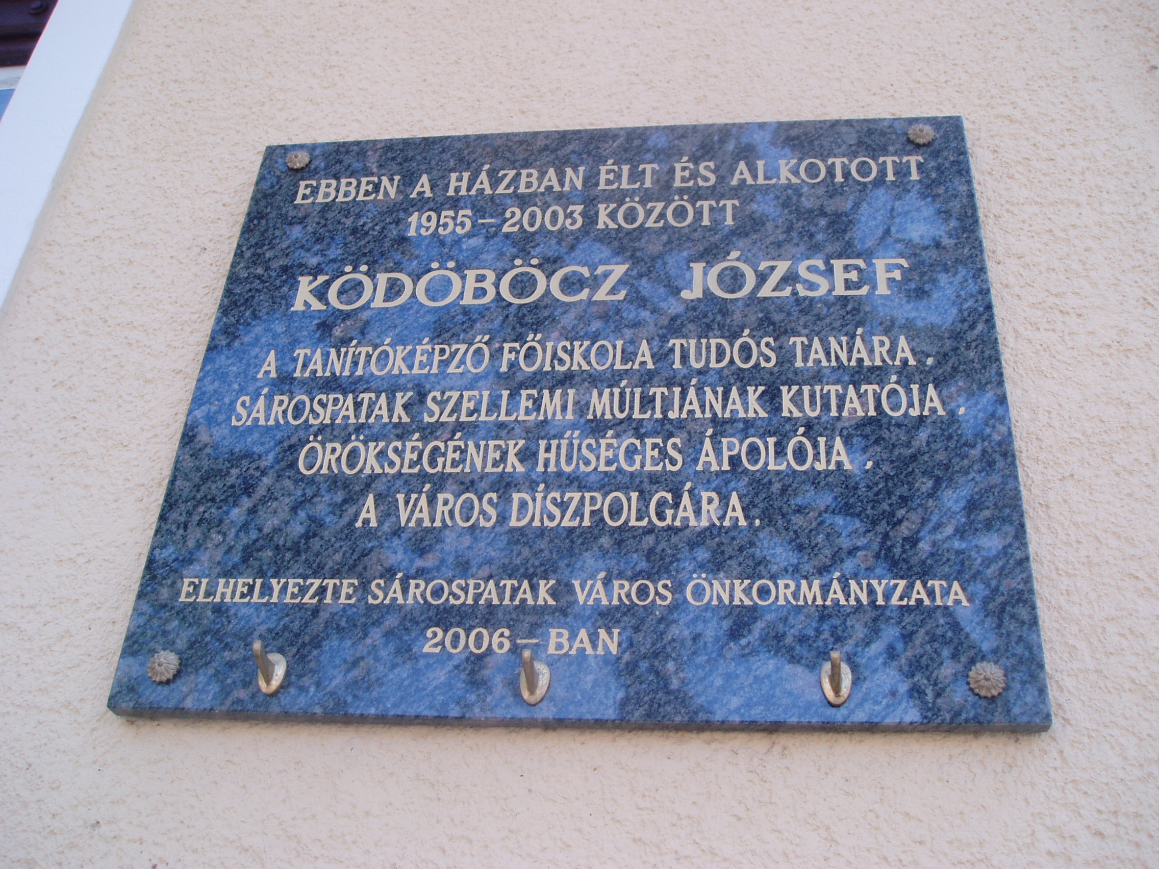 Nyilvános 1043 | 1500 | Sárospatak, Rákóczi utca 21. | Ebben a házban élt és alkotott csaknem fél évszázadon keresztül haláláig Ködöböcz József (1913-2003), a Tanítóképző Főiskola tudós tanára. Élete és munkássága hetvenöt éve kötődik szorosan a Bodrog-parti Athén szellemiségéhez, amióta beregi szülőföldjét odahagyta, hogy előbb diákja, majd pedig tanára legyen a református kollégiumnak, illetve a belőle kinőtt tanítóképzőnek. Oktató és nevelő tevékenysége mellett rendszeres helytörténeti kutatásokat végzett. Először 1957-ben, a sárospataki tanítóképző centenáriuma alkalmából foglalta össze a nevelőképzés helyi históriáját, majd több részpublikáció után 1986-ban adta ki Tanítóképzés Sárospatakon – A kollégiumi és középfokú képzés négy évszázada című alapművét. Monográfiákban dolgozta fel Dezső Lajos (1984), Árvay József (1997) és Finkey Ferenc jogászprofesszor, kúriai tanácselnök életművét (1999), s nagy sikert aratott Sárospatak a magyar művelődés történetében című kötete (1991). Szerkesztette a Bibliotheca Comeniana című neveléstörténeti kiadványsorozatot. A fénykép 2007 augusztusában készült. Felh. irod.: Kováts Dániel: Ködöböcz József és a sárospataki helyismeret. = Honismeret 2001. 2. |