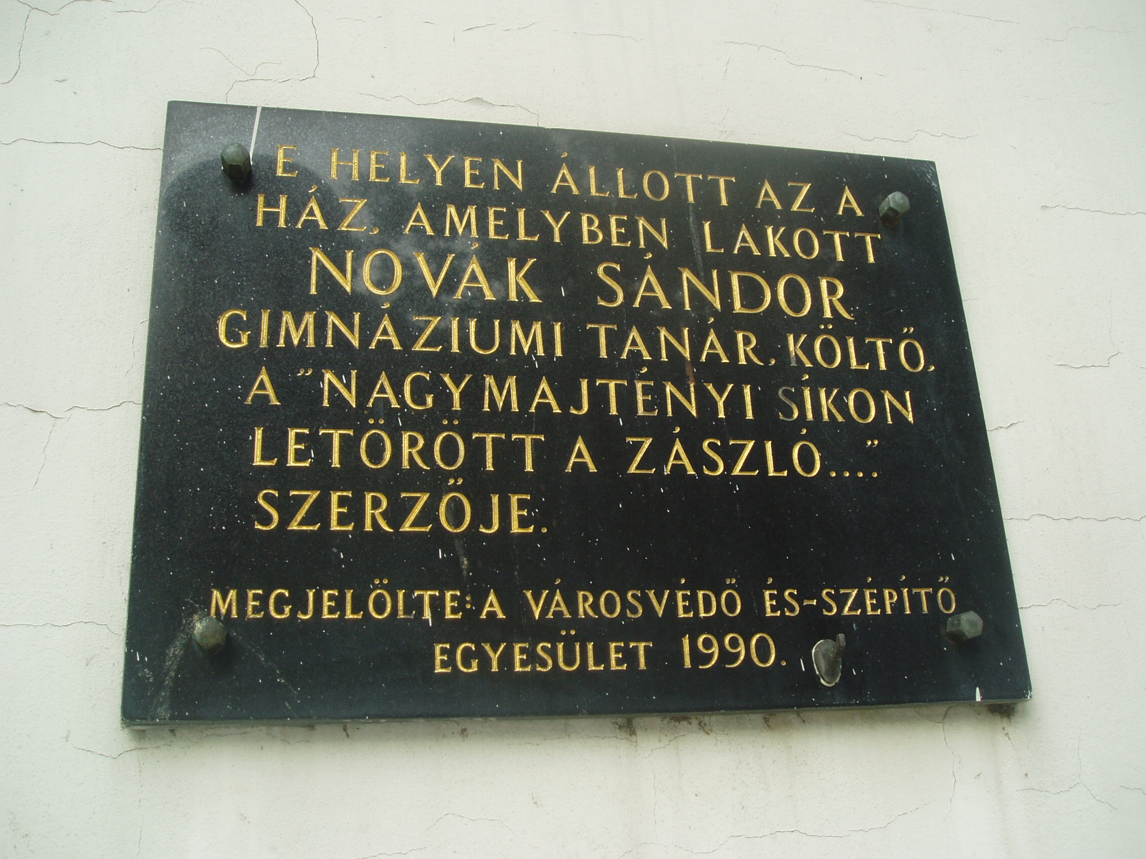 Nyilvános 1107 | 1597 | Sárospatak, Rákóczi utca 32. | Az épület voltaképpen már a Hild tér részét képezi, amelyet Makovecz Imre és az általa a munkába bevont fiatal építészek tervei alapján alakítottak ki az 1980-as években. Itt, a Hild tér felőli oldalon helyezték el Novák Sándor gimnáziumi tanár emléktábláját: E HELYEN ÁLLOTT AZ A HÁZ, AMELYBEN LAKOTT NOVÁK SÁNDOR GIMNÁZIUMI TANÁR, KÖLTŐ, A „NAGYMAJTÉNYI SÍKON LETÖRÖTT A ZÁSZLÓ….” SZERZŐJE. MEGJELÖLTE A VÁROSVÉDŐ ÉS –SZÉPÍTŐ EGYESÜLET 1990. Az eredeti, a Rákóczi utca 44. számot viselő lakóházat, amelyet még 1966-ban jelöltek meg emléktáblával, lebontották. Az emléktáblán is említett, országszerte kuruc dalként ismert ének zenéjét és szövegét valójában Novák Sándor írta, aki a XX. század első évtizedeiben volt a gimnázium tanára. A fénykép 2007 augusztusában készült. Felh. irod.: www.sarospatak.hu/nevezetessegek Barsi Ernő – Szabó Ernő: A pataki kollégium zenei krónikája. Bp. Zeneműkiadó, 1984 |