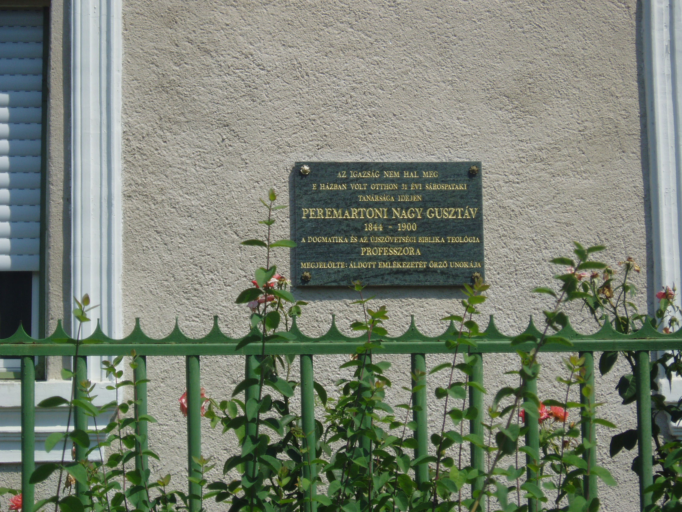 Nyilvános 1061 | 1695 | Sárospatak, Szemere utca 9. | Több, mint három évtizedig élt ebben a házban Peremartoni Nagy Gusztáv (1844-1900), a Református Kollégium teológia professzora. Egykori lakóházát unokája jelölte meg emléktáblával. A fénykép 2007 augusztusában készült. |