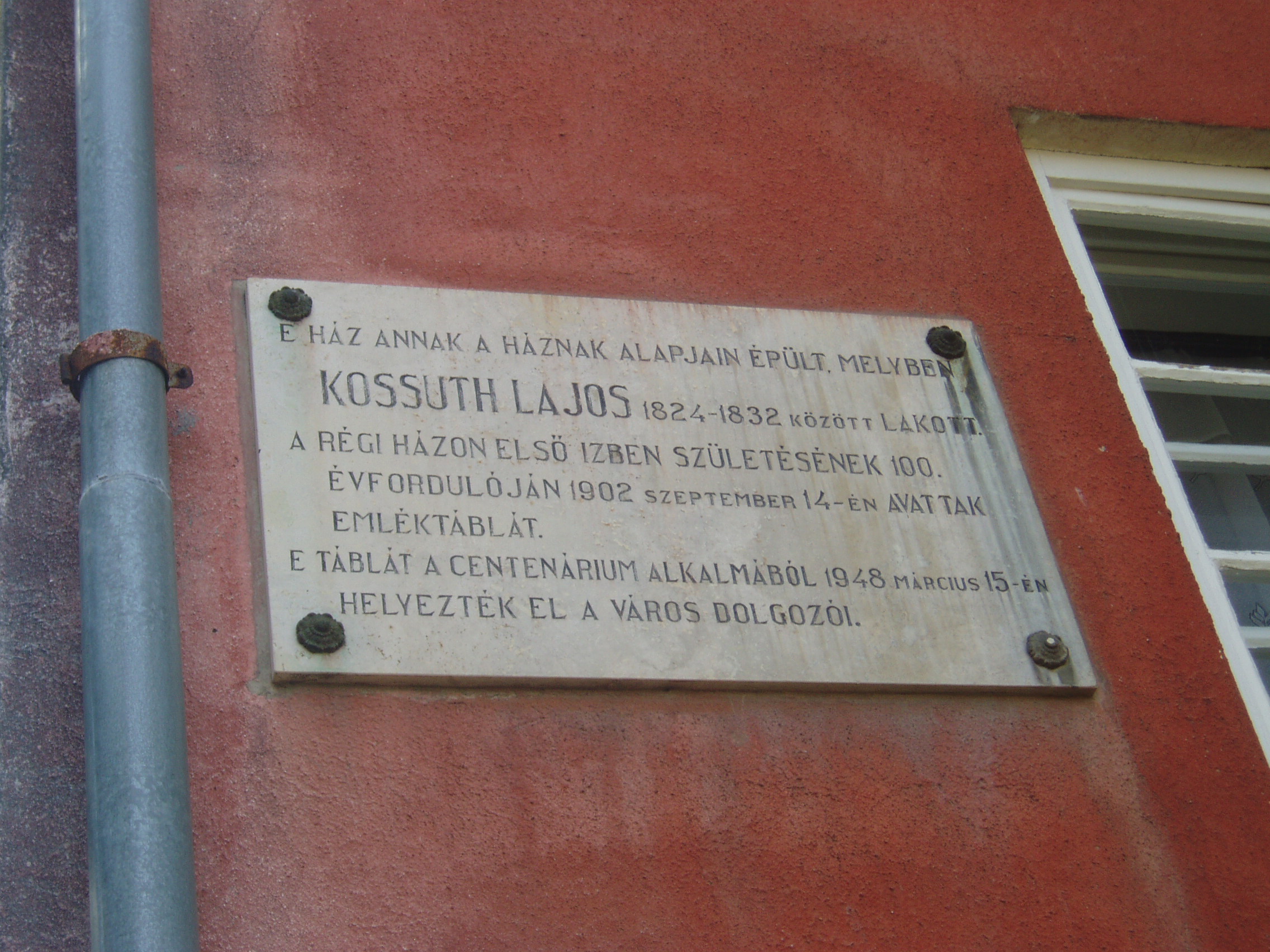 Nyilvános 1081 | 1877 | Sátoraljaújhely, Hősök tere 8. | Az emléktábla tanúsága szerint ez a ház annak a régi háznak alapjain épült, amelyben a Kossuth család 1824 és 1832 között lakott. Kossuth Lajos szülei - Kossuth László, az Andrássy grófok uradalmi ügyésze és Weber Karolin - házasságkötésüket követően Monokra költöztek szolgálati lakásba. Ott született meg 1802. szeptember 19-én Kossuth Lajos. A szülők a néhány hónapos csecsemővel Olaszliszkára költöztek (ott éltek Kossuth anyai nagyszülei). 1808-ban, a tehetséges kisfiú iskoláztatása miatt Sátoraljaújhelyen telepdtek le (lásd: Sátoraljaújhely, Móricz Zs. u. 17.), ahol Kossuth Lajos a piarista iskola (lásd: Sátoraljaújhely, Deák F. u. 10-12.) növendéke lett. Amikor a Kossuth család ebben a házban élt, a húszas éveiben járó Kossuth Lajos már jogot végzett fiatalember volt. 1821-24 között Pesten tevékenykedett, de 1824-ben hazatért Sátoraljaújhelyre, hogy egyetlen fiúként könnyíthessen idősödő apja terhein és segítsen a család egyre növekvő gondjain, amelybe időközben több lánytestvér is született. A család eredeti házát Kossuth Lajos születésének 100. évfordulóján, 1902-ben jelölték meg emléktáblával. Az utódépületen látható táblát 1848 centenáriumán állították. A fénykép 2007 augusztusában készült. Felh. irod.: Ács Tibor: Kossuth Lajos. Bp. MH OKAK, 1994 http://teroses.atw.hu/eletrajz.htm |