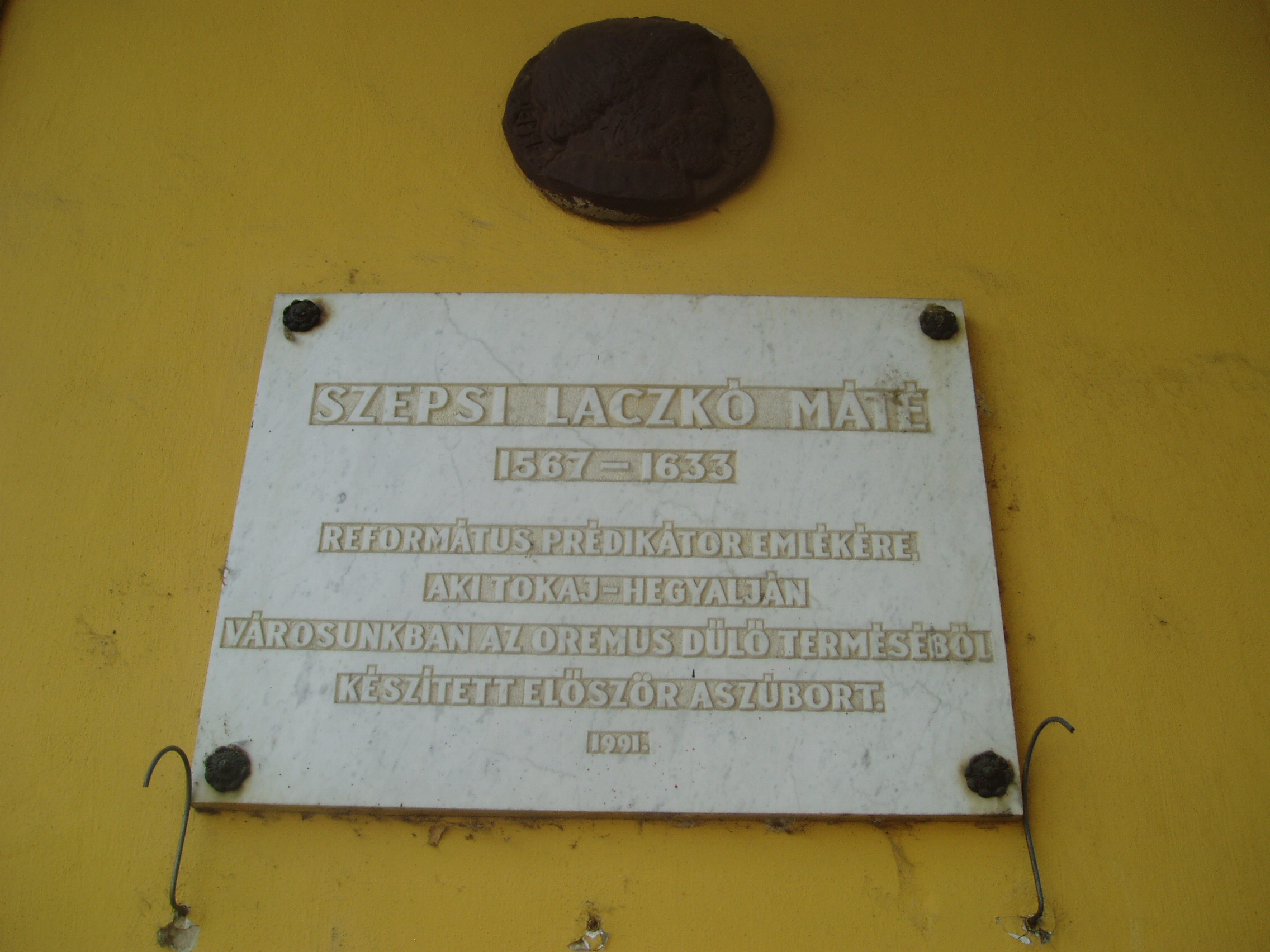 Nyilvános 1072 | 1610 | Sátoraljaújhely, Kossuth tér 24. | A város fő terének egyik szép, régi épületén elhelyezett emléktábla szerint elsőként Sátoraljaújhelyen készített tokaji aszút 1631 körül Szepsi Laczkó Márton (1567-1633) református prédikátor, Lórántffy Zsuzsanna udvari lelkésze a fejedelemasszony számára az Oremus dűlő terméséből. A hagyomány szerint az országot érő támadások miatt későn szüretelt szőlő tartalmazott olyan „beteg” szőlőszemeket is amelyeket ma az aszú készítéséhez használnak. Az elkészült, miseborként is használt italban fedezte fel Szepsi Laczkó Máté a különleges ízvilágot és ajánlotta fel a bort a fejedelemasszonynak. Az aszú készítésének első leírását is neki tulajdonítják. A hagyománynak azonban ellentmond, hogy már az 1590-es években - Szikszai Fabricius Balázs latin–magyar szótárában - használták az „aszú szőlő” kifejezést. A fénykép 2007 augusztusában készült. Felh. irod.: www.tokaj.hu/magyar/atokaji/az-aszu/index.php |