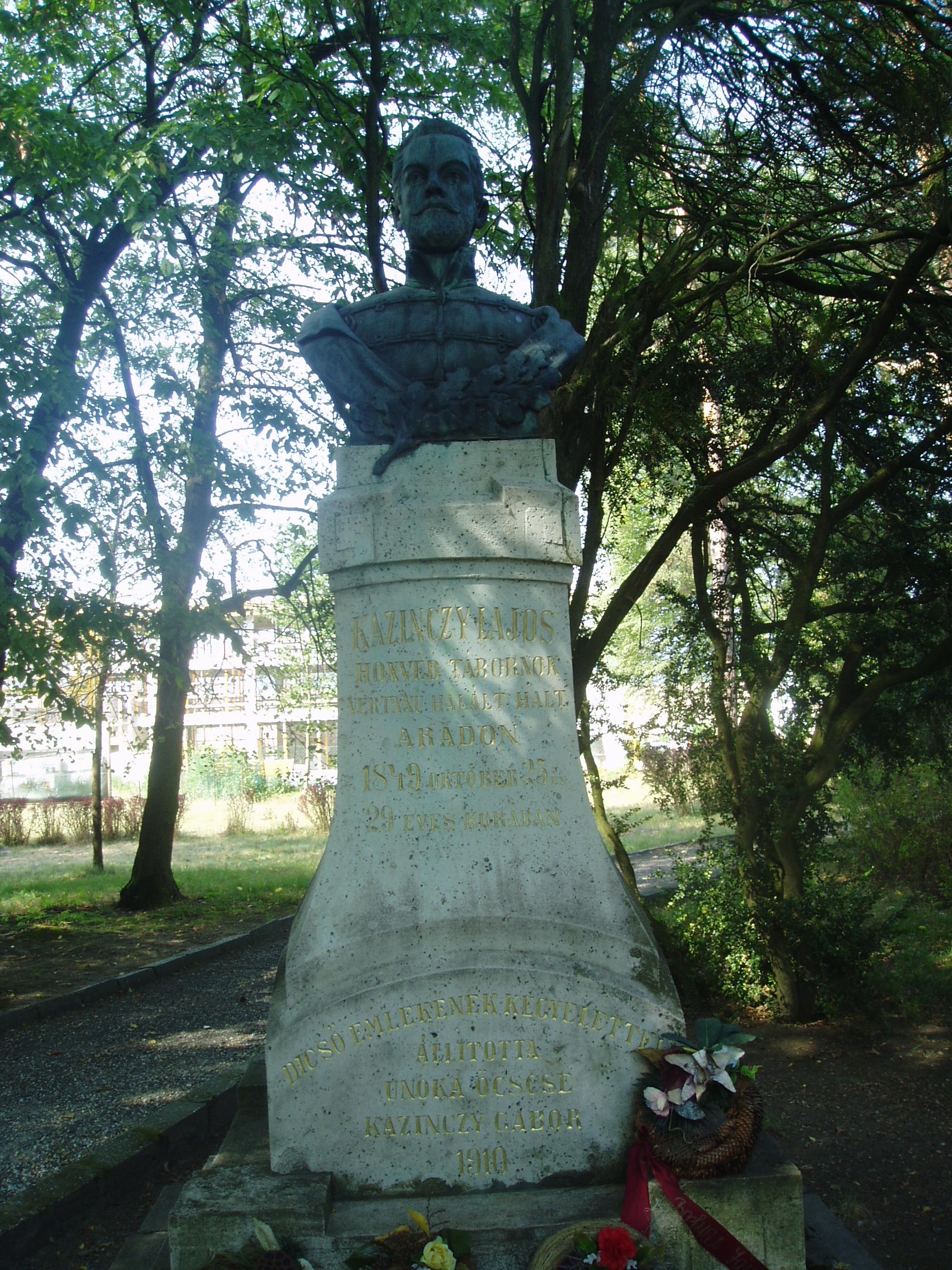 Nyilvános 1089 | 1632 | Széphalom: A Kazinczy család sírkertje - Kazinczy Lajos szobra | A Kazinczy Emlékcsarnok parkja - Kazinczy Ferenc egykori kúriájának kertje - ma természetvédelmi terület. A mauzóleumból fasor vezet a Kazinczy család sírkertjébe. A kis temető helyét 1806-ban, első gyermeke, az egyéves korában elhunyt Iphigenia halálakor Kazinczy maga jelölte ki. Már akkor megírta barátainak, hogy felesége és ő is oda fognak temetkezni. Legkisebbik fiuk, Lajos, Aradon szenvedett vértanúhalált a honvédsereg ezredeseként. 1849. október 25-én, 29 éves korában végezték ki. Földi maradványait az aradi vársánc rejti. Szülei sírjának közelében felállított mellszobra idézi emlékét. A szobor másolata a sárospataki kollégium kertjében látható (lásd: Sárospatak, Iskolakert: Kazinczy Lajos). A fénykép 2007 augusztusában készült. Felh. irod.: Látnivalók Borsod-Abaúj-Zemplén megyében. Miskolc, Well-PRess, 2004 www.vendegvaro.hu Pávai Gyula: Kazinczy Lajos emléktáblája Aradon. = Széphalom. A Kazinczy Ferenc Társaság Évkönyve 13. kötet, 2003 |