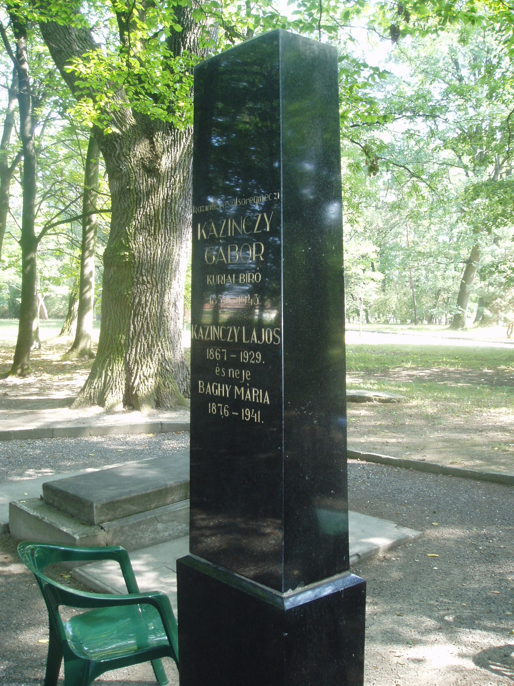Nyilvános 1101 | 1680 | Széphalom: A Kazinczy család sírkertje | A Kazinczy Emlékcsarnok parkja - Kazinczy Ferenc egykori kúriájának kertje - ma természetvédelmi terület. A mauzóleumból fasor vezet a Kazinczy család sírkertjébe. A kis temető helyét 1806-ban, első gyermeke, az egyéves korában elhunyt Iphigenia halálakor Kazinczy maga jelölte ki. Már akkor megírta barátainak, hogy felesége és ő is oda fognak temetkezni. Kazinczy és felesége sírja körül négy gyermekük, két unokájuk, három dédunokájuk és más rokonuk nyugszik. A képen Kazinczy Gábor kúriai bíró (1857-1943), Kazinczy Ferenc unokája (Bálint nevű fiának fia) és Kazinczy Lajos (1856-1929), az író dédunokája és felesége sírja látható. A fénykép 2007 augusztusában készült. Felh. irod.: Látnivalók Borsod-Abaúj-Zemplén megyében. Miskolc, Well-PRess, 2004 www.vendegvaro.hu Busa Margit: Adalékok a Kazinczy család történetéhez. = Széphalom. A Kazinczy Ferenc Társaság Évkönyve 12. kötet, 2002 |