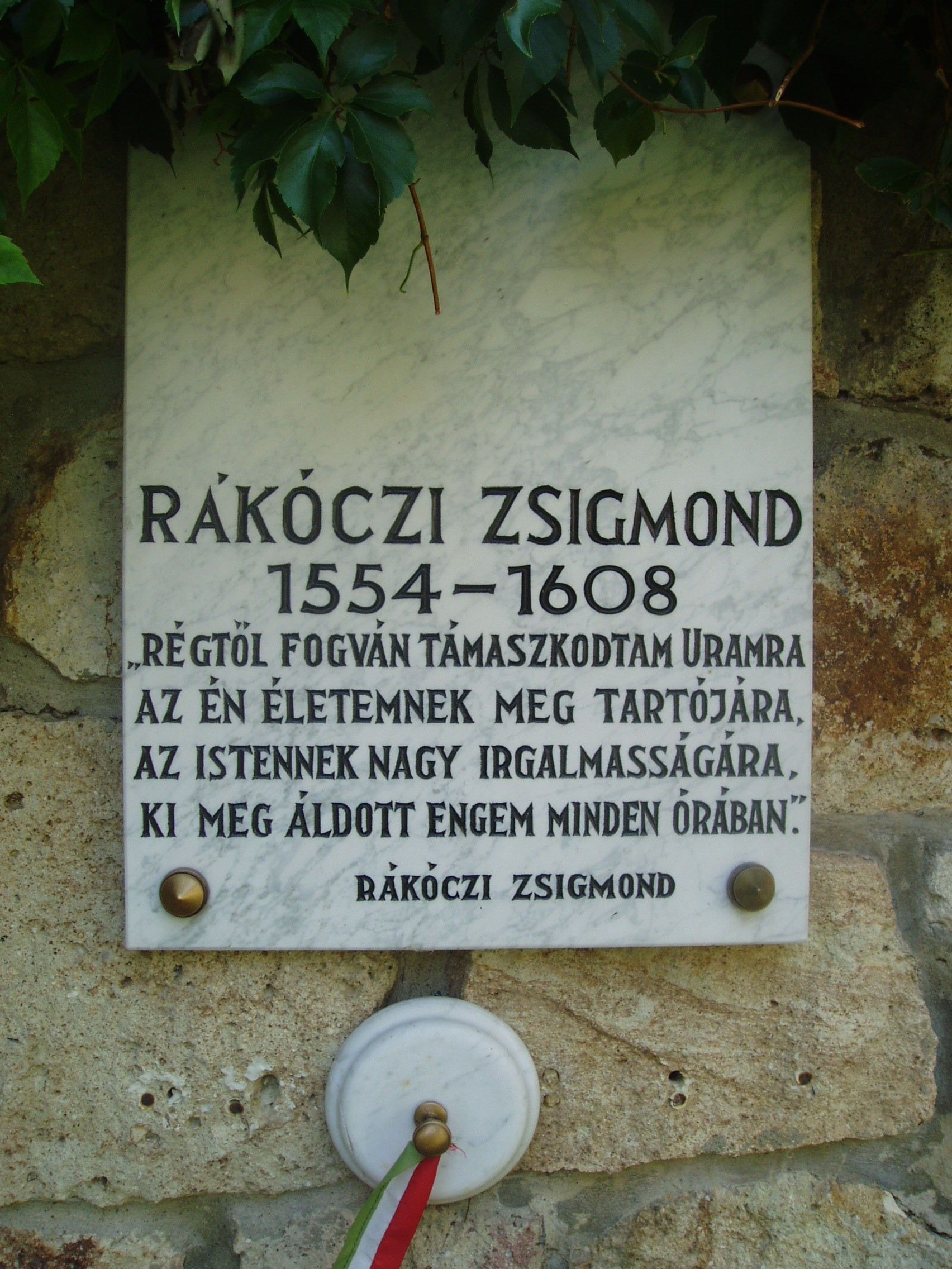 Nyilvános 1059 | 1533 | Szerencs, Huszárvár utca 11. Zempléni Panteon: Rákóczi Zsigmond (1544-1606) emléktáblája | A szerencsi Rákóczi várnál 1996-ban, a honfoglalás ezredeik évfordulója alkalmából állították fel a jeles zempléni személyiségek panteonját. Rákóczi Zsigmond volt a Rákóczi család vagyonának és tekintélynek megalapozója. Korának legnagyobb politikai karrierjét futotta be. 1544-ben egy kisbirtokosi családba született, de ügyes pénzügyi manővereinek és jó házasságainak köszönhetően nagy kiterjedésű és jelentős birtokok, várak, kastélyok ura lett, s életének utolsó időszakában Erdély fejedelmének választották. A tokajiból kiszakított szerencsi uradalom zálogbirtokát 1583-ban kapta meg, s ez 1603-ban a család örökös tulajdona lett. Itt építette meg Zsigmond a Rákócziak első várerődítményét. Itt születtek fiai: György, (a későbbi erdélyi fejedelem), Zsigmond és Pál. Több évtizeden át, (egészen 1616-ig) Szerencs volt a Rákóczi-birtokok központja. Végső akarata szerint ide temették el az első Rákóczit, aki Erdély fejedelmi címét is viselte (lásd: Szerencs, Kossuth tér 4.). Az õ anyagi támogatásával jelent meg Károli Gáspár fordításában a magyar biblia. A fénykép 2007 augusztusában készült. Felh. irod.: Fazekas Lászlóné: Szerencs. Szerencs, Szerencsi Hírek Szerkesztősége, 1997 www.vendegvaro.hu Látnivalók Borsod-Abaúj-Zemplén megyében. Miskolc, Well-PRess, 2004 www.hermuz.hu/aktual/archiv/kiallarc3.htm |