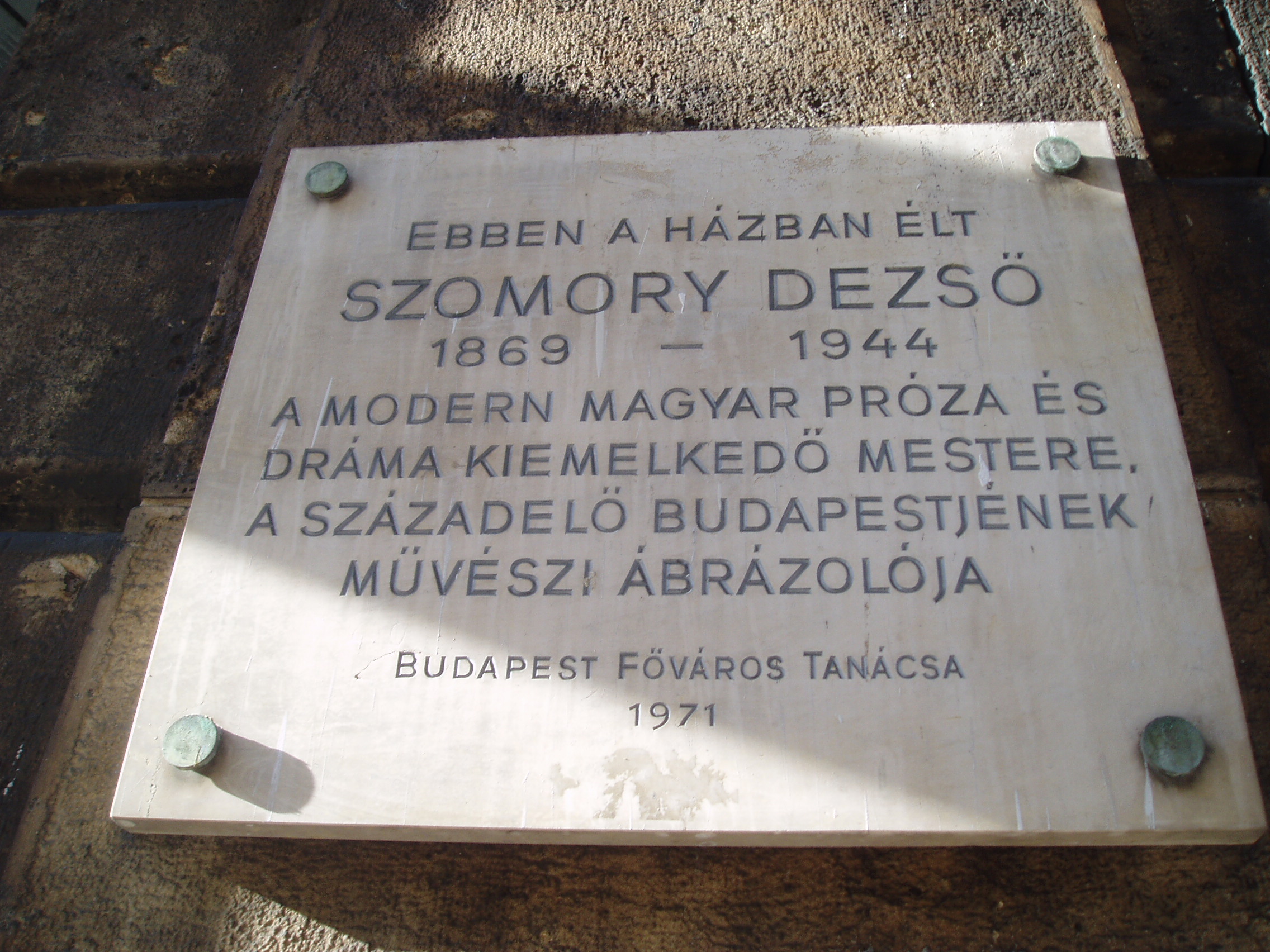 Nyilvános 1205 | 1804 | Budapest, V. Sütő utca 2. | Az e ház padlásterében kialakított hatalmas, egyterű lakásban élt Szomory Dezső 1906-tól 1930-ig. Sok jeles művét írta itt, többek között Hermelin című, önéletrajzi ihletésű színművét, amelynek a helyszínekről szóló szerzői utasításai egyértelműen saját lakását írják le: "És az ablakon át, ha felhúzzák a függönyt, a város háztető- és kéményrengetege látszik, egy-egy templomtorony arany csúcsával a végtelen égboltozat alatt. Mert ez itt egy padlásból épült lakás, amit a dimenziók sejtetnek is. És egészen közelről hallani a templomi harangszót..." Ez a nevezetes lakhely ihlette Kellér Andor Szomory Dezsőről írott regényének címét: Író a toronyban. A lakás részletes leírását e műben is olvashatjuk. Az író emléktábláját 1971-ben avatták fel. A fénykép 2007 májusában készült. Felh. irod.: Réz Pál: Szomory Dezső alkotásai és vallomásai tükrében. Bp. Szépirodalmi Kiadó, 1971 |