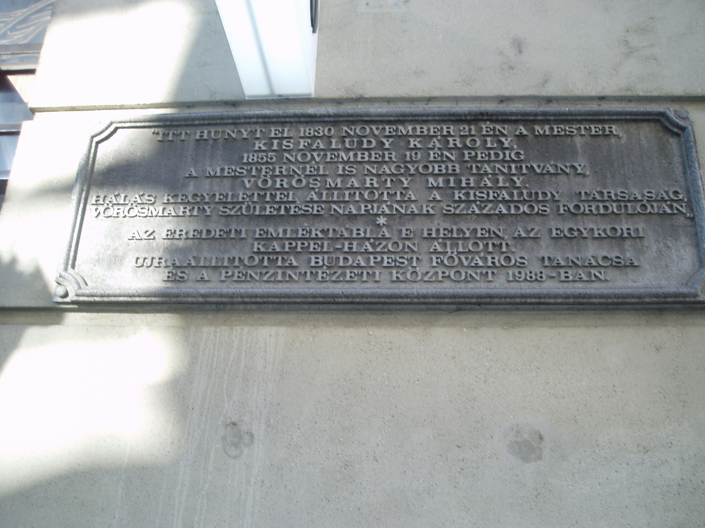 Nyilvános 1135 | 1767 | Budapest, V. Váci utca 19. | A mai irodaépület helyén egykor az ún. Kappel-ház állott (a második világháborúban bombatalálat érte, megmaradt részét az 1960-as években bontották le). A Kappel-házban hunyt el 1830. november 21-én Kisfaludy Károly, majd negyedszázaddal később, 1855. november 19-én Vörösmarty Mihály. Mindkettejüket az udvaron ravatalozták föl. Már az eredeti Kappel-házat is megjelölték a két költő közös emléktáblájával. Az irodaépület elkészülte után azonban új emléktáblát tettek a házra - igaz, az eredeti szöveggel. 2003-ban azonban Ráday Mihály felfedezte az épségben maradt eredeti emléktáblát a Kiscelli Múzeumban, s lépéseket tett, hogy ezt a táblát helyezzék vissza a házra. 2006 őszéig, amikor e fényképet készítettem, javaslata nem vált valóra... Zenei érdekessége is van a helynek: az 1950-es években még állt az eredeti Kappel-ház földszintje, ebben működött a közkedvelt Kedves Presszó. Egyéb lehetőség híján itt zongorázott ekkoriban Cziffra György. Kevéssel ezután külföldön akart szerencsét próbálni, de az AVH elfogta és büntetőtáborba vetette. Csak 1956-ban jutott ki Párizsba, ahol szinte "egycsapásra" világhírű lett. A zongoraművész Ágyúk és virágok címmel írta meg visszaemlékezéseit. A fénykép 2005 májusában készült. Felh. irod.: N. Kósa Judit: Egy békebeli üzenet. = Népszabadság 2006. szept. 16. Erős Zoltán: Magyar irodalmi helynevek A-tól Z-ig. Bp. 1985, Móra Kiadó www.mtv.hu/cikk.php?id=2679 |