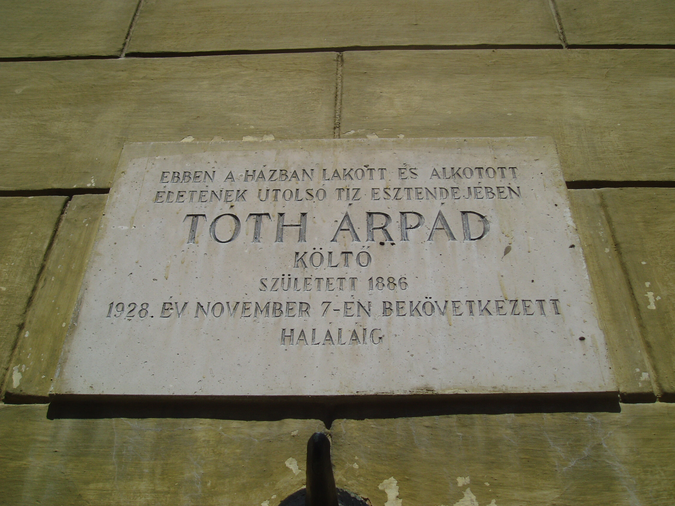Nyilvános 1190 | 1987 | Budapest I. Táncsics Mihály utca 13. | Az egyemeletes ház középkori alapokra épült. 1823-ban, majd mai formájára 1880-ban alakították át. Mint a homlokzatán elhelyezett emléktáblán is olvasható, itt élt - egy első emeleti kis, bérelt lakásban - élete utolsó tíz évében Tóth Árpád (1886-1928) költő feleségével, Annuskával és 1920-ban született kislányával, Eszterrel. Itt írta Az öröm illan és a Lélektől lélekig c. köteteinek legtöbb versét. Lakásán hunyt el 1928. november 7-én tüdőbajban. Lánya, Tóth Eszter, aki édesapja halálakor mindössze nyolc éves volt, szintén irodalmár - költő, író, műfordító -lett. Édesapjáról, családjáról - köztük apai nagyapjáról, Tóth András szobrászról - emlékezéseket, tanulmányokat írt, bennük sok eredeti forrást, levelet is közzétett. A fénykép 2007 májusában készült. Felh. irod.: Zakariás G. Sándor: Budapest. Bp., Képzőműv. Alap, 1961 /Magyarország művészeti emlékei 3./ Erős Zoltán: Magyar irodalmi helynevek A-tól Z-ig. 2. bőv. átd. kiad. Bp. Kis-Lant Kiadó, 1995 Tóth Eszter: Családi emlékek Tóth Árpádról. Bp. Magvető, 1985 |