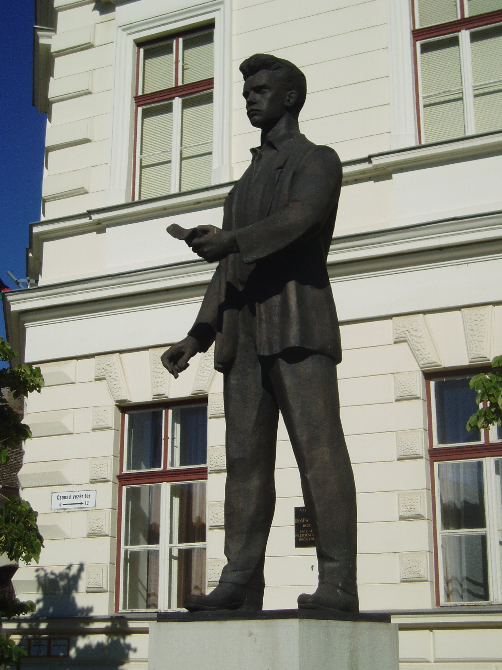Nyilvános 1171 | 1736 | Makó, Csanád vezér tér 6. József Attila Gimnázium | A város központjából északra nyílik a sugárútszerű Csanád vezér tér. Nyugati oldalán áll a József Attila Gimnázium 1895-ben, eklektikus stílusban, Gerle Lajos tervei alapján emelt épülete. Itt tanított négy évig Juhász Gyula, itt tanult József Attila, majd Erdei Ferenc. A tizenöt és fél éves József Attila 1920 októberében érkezett Makóra. Verseire Juhász Gyula figyelt fel, akinek pártfogása révén a nyugat is közölt néhányat belőlük. Makói diák volt, amikor tizenhét éves korában Szegeden megjelent első verseskötete, a "Szépség koldusa", Juhász Gyula prófétikus előszavával: "A legnagyobb készséggel és örömmel vállalkoztam arra, hogy József Attila első verses könyvéhez előszót írjak. Ez a nagyon fiatal és nagyon tehetséges költő a legteljesebb mértékben megérdemli, hogy a figyelem feléje forduljon, hogy igaz szeretettel és reménységgel fogadja a magyar olvasóközönség és hogy a kritika se menjen el mellette közömbösen vagy ellenségesen és ne elégedjék meg vele szemben a nyomtatásban megjelenőknek rendesen kijáró vállveregetéssel. József Attila Isten kegyelméből való költő." Az épület előtt áll 2005-ben, születése centenáriumán újjáavatott szobra, a járdába ágyazottan pedig első verseskötetének bronzba öntött címlapja idézi emlékét. A fénykép 2007 júliusában készült. Felh. irod.: Barangolások Csongrád megyében. Miskolc, Well-PRess, 1997 |