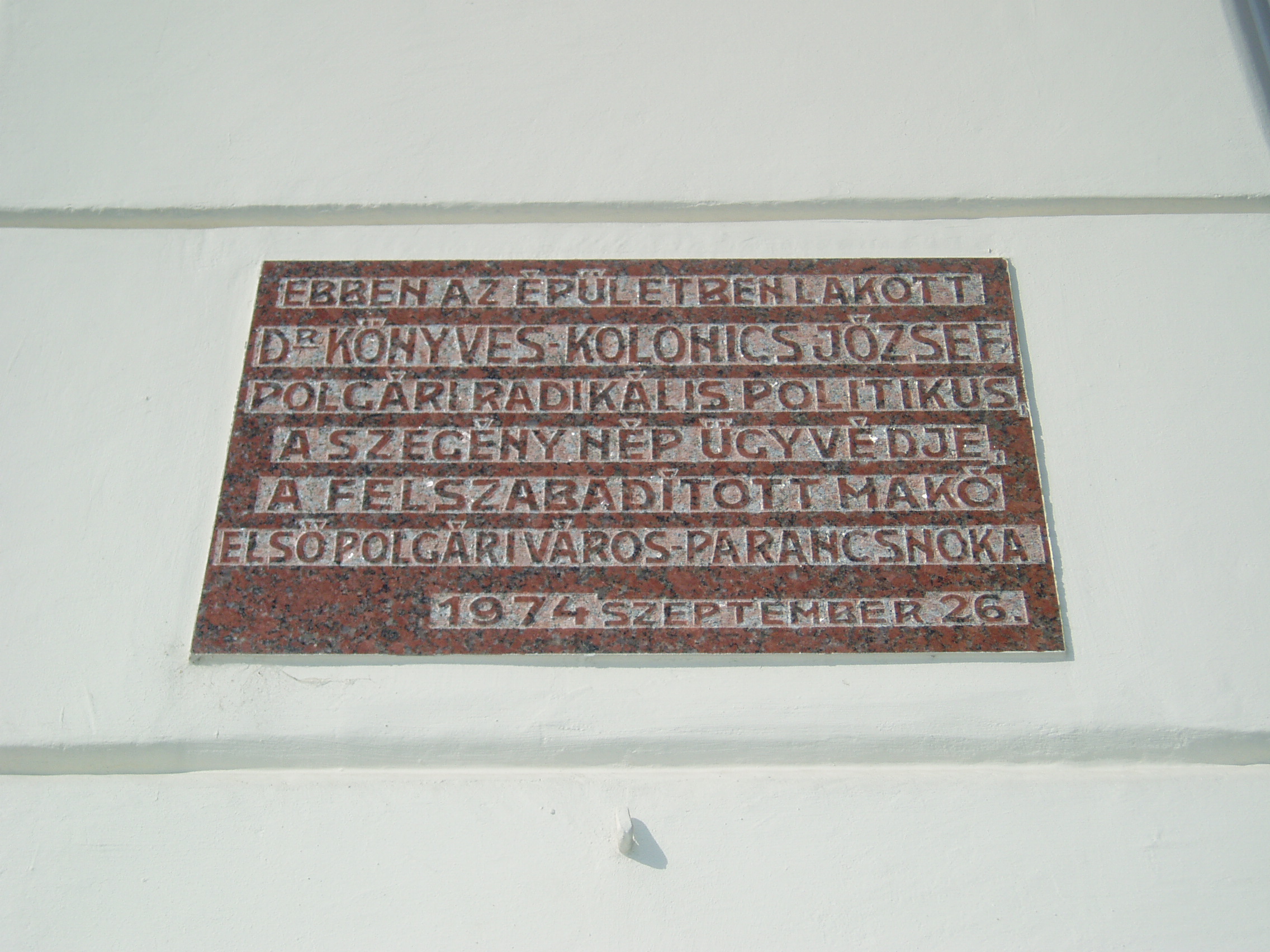 Nyilvános 1094 | 1576 | Makó, József Attila utca 2. | Ebben a házban lakott Könyves Kolonics József (1884-1955) polgári radikális politikus, a szegények ügyvédje, 1945 után Makó első polgári városparancsnoka. Emléktábláját születésnek 90. évfordulóján állították. A fénykép 2007 júliusában készült. |