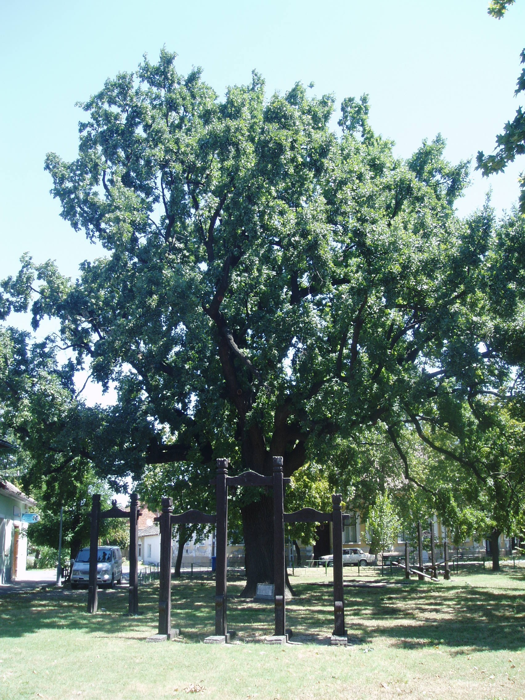 Nyilvános 1099 | 1655 | Makó, Megyeház utca 16. Juhász Gyula-emlékfa | A Megyeház utca 16. számú ház előtti kis parkban áll a Juhász Gyula-emlékfa. A másfél méter törzsátmérőjű kocsányos tölgyet az 1810-es években ültették. Juhász Gyula gyakran kereste fel makói tartózkodása idején. A fénykép 2007 júliusában készült. Felh. irod.: Barangolások Csongrád megyében. Miskolc, Well-PRess, 1997 |