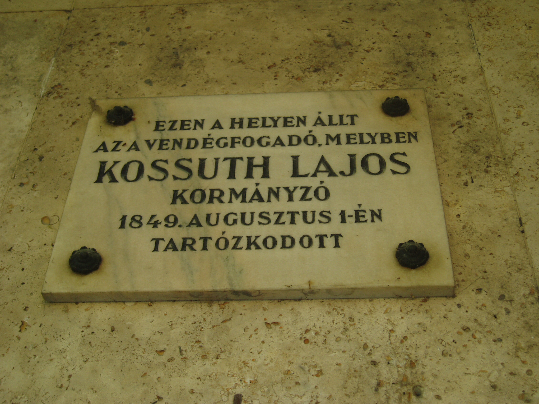 Nyilvános 1069 | 1431 | Makó, Széchenyi tér 15. | A Széchenyi teret déli oldalról az 1970-ben épült ún. csipkeházsor határolja, földszintjén üzletekkel. Rajta feliratos tábla idézi Kossuth Lajos emlékét, aki 1849. augusztus 1-jén a jelenlegi ház helyén álló hajdani fogadó vendége volt. A fénykép 2007 júliusában készült. Felh. irod.: Barangolások Csongrád megyében. Miskolc, Well-PRess, 1997 |